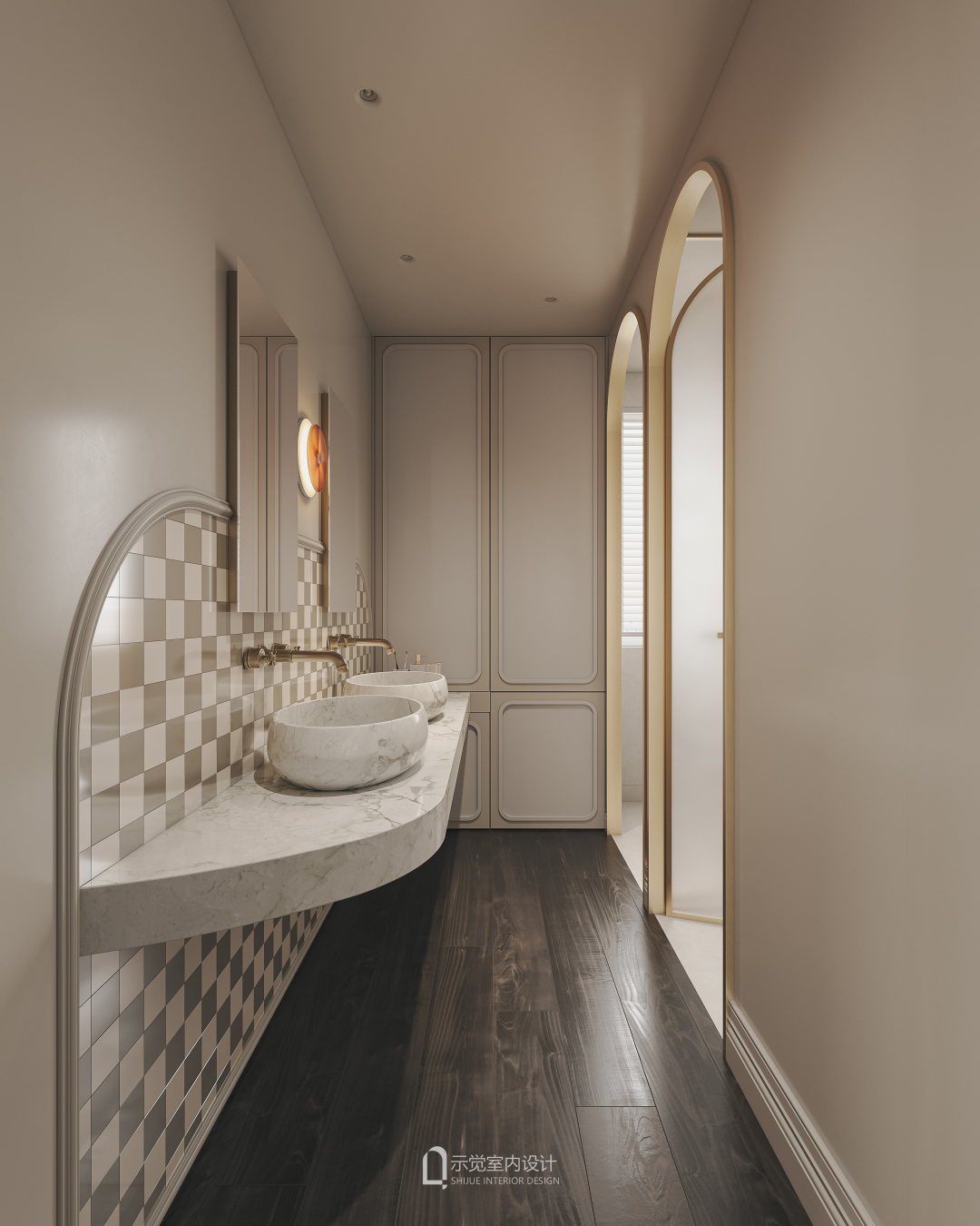 干区的双台盆,大理石结合棋盘格造型小砖,对面拱形磨砂玻璃门分别进入淋浴间和马桶区域。