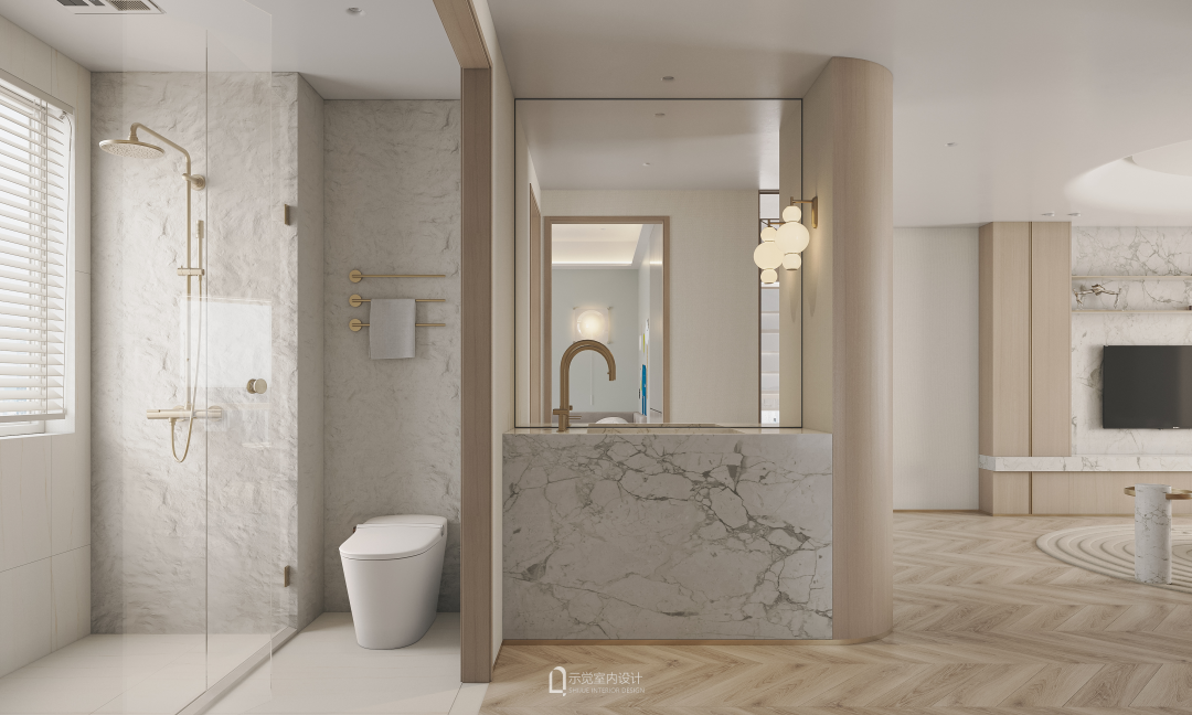客卫干湿分离的设计,干区用正面的大理石打造成干区台盆,湿区背景墙采用有凹凸质感的访自然石材。