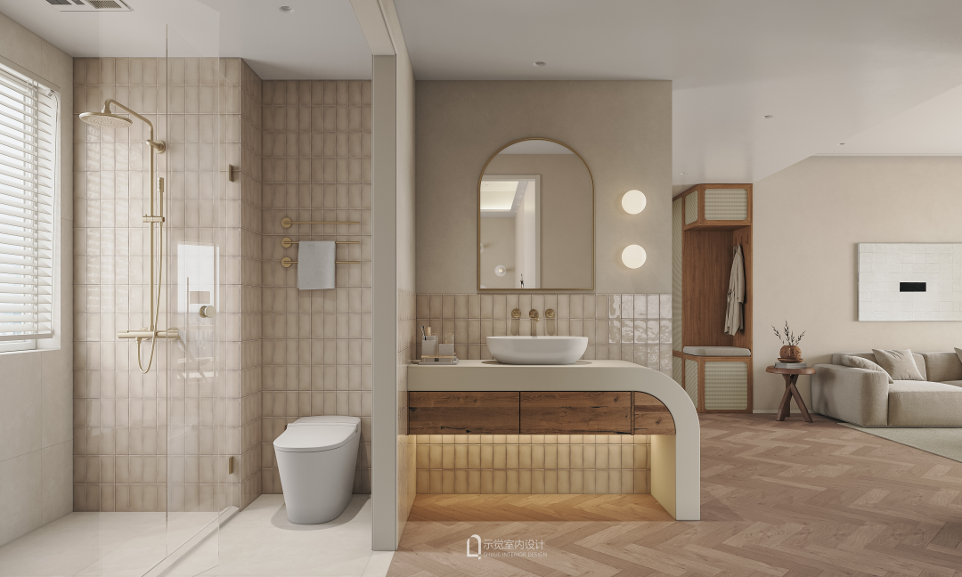 客卫干湿分离设计,干区作为景观洗手池,微水泥台面,搭配复古手工砖,拉丝黄铜五金,古朴的气质淋漓尽致。