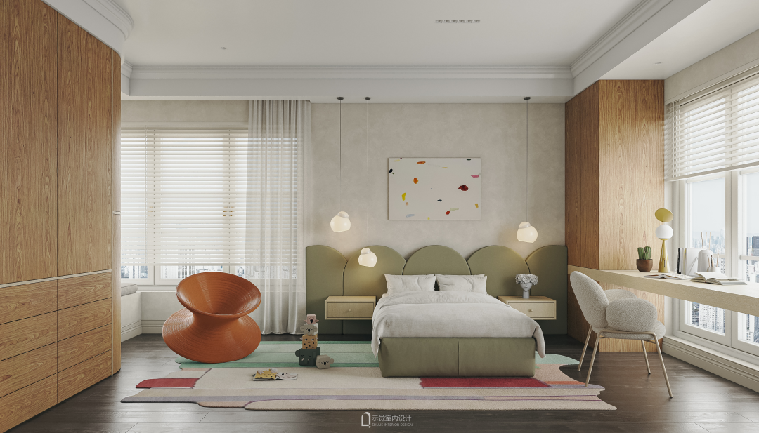 儿童房大套间的设计,床边充足的儿童活动空间,足够一边作为书桌,一边作为玩耍活动来使用。Magis陀螺椅,一抹橙色点缀出儿童房的活力。