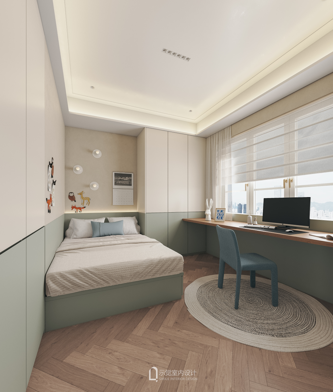 儿童房绿色,米色上下分色设计,和客餐厅的暖色系协调整体,又多了一丝儿童房的趣味。