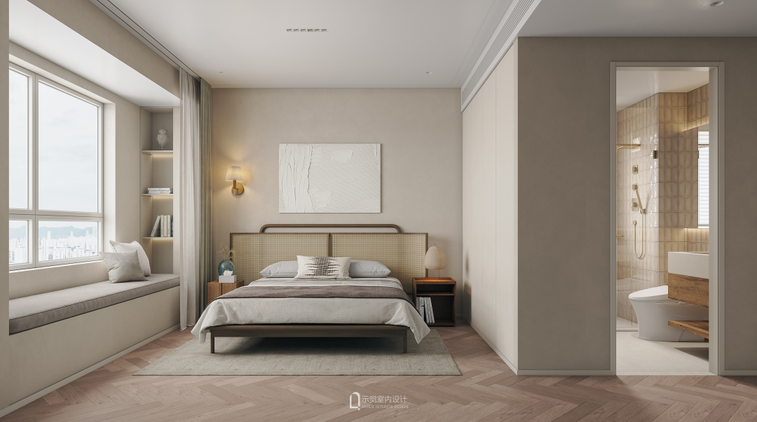 人字拼实木地板+原木镶嵌藤编组合的柜体,自然舒适,软装部分采用了原木有机造型做搭配,空间氛围整体统一。