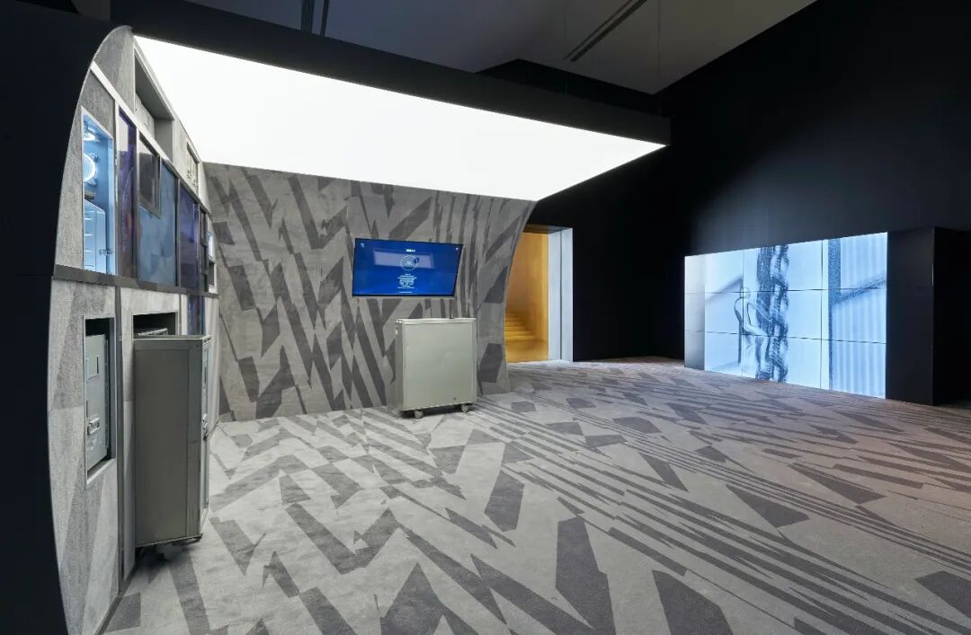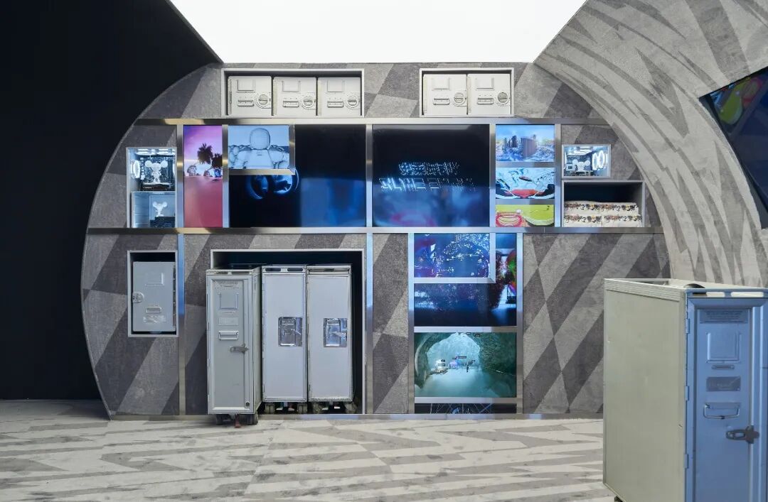 “信息买手店”这个词挺贴切的。我们从最初的创作开始就一直是在处理各种信息数据。这个空间可以理解为我们从一台装载着无数虚拟展览数据的飞行器上,解剖了一个截面展示出来。它的内部呈现出错乱的网格图像,类似三维软件里的基础界面,由一个个待编辑的三维模型和编辑工具以模块化的形式拼装、组合起来,显示这一“航空厨房”始终处于正在编辑的未完成状态。每块屏幕、每个空格都随时可能被新的信息或工具替换,在被格式化之前,它们会像商品一样静静躺在厨房。