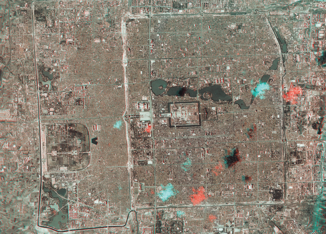 图10  笔者利用KH-7卫星1966年9月连续拍摄的两张照片合成的北京市假彩色3D照片