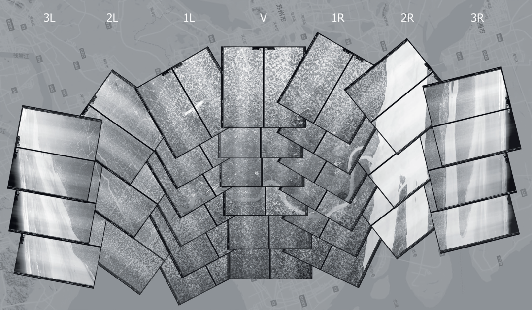 图1  1964年7月U-2执行侦察任务时在两分钟内于上海地区拍摄的30帧、60幅底片的覆盖合成图。中央为上海市区与浦东,左侧为杭州湾与浙江省一部分,右侧为崇明岛、长江口与江苏省启东地区