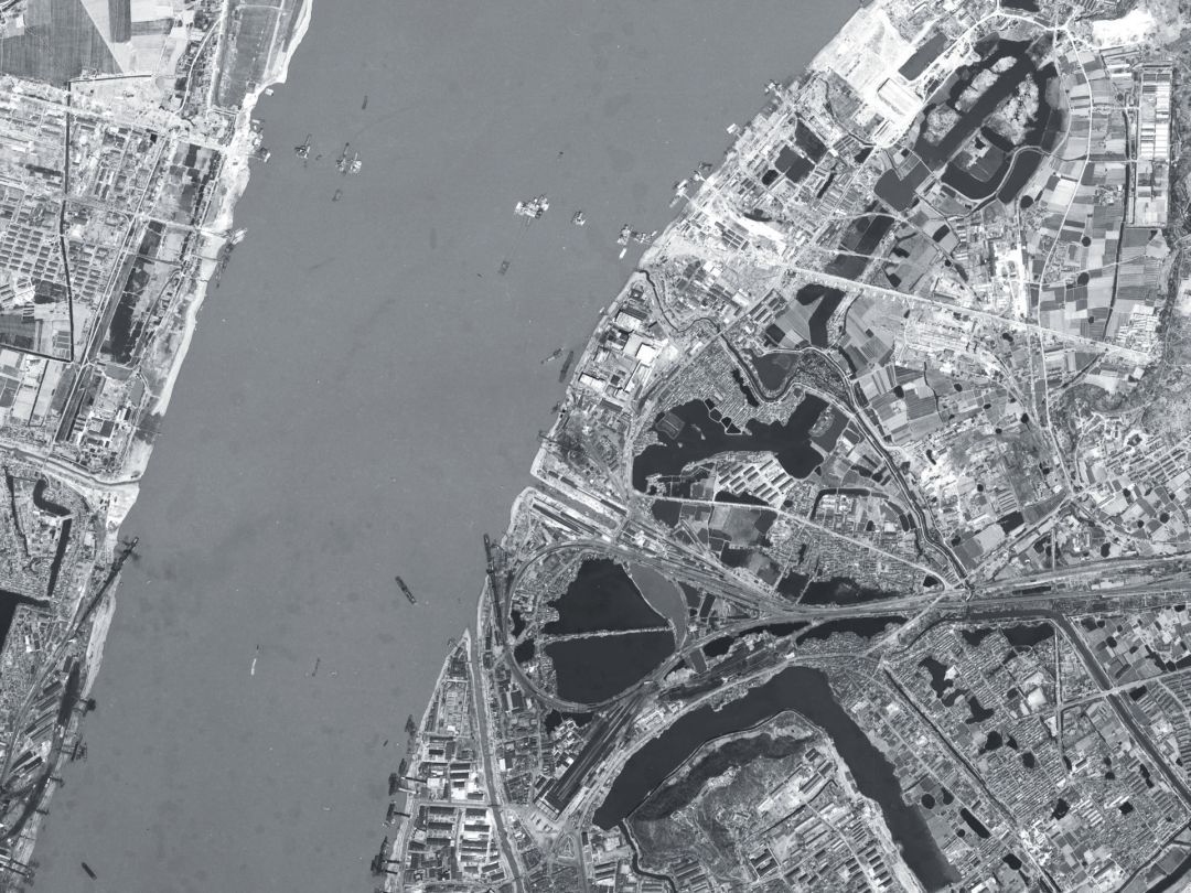 图4  U-2侦察机于1962年3月拍摄的建设中的南京长江大桥。长江中可见施工中的桥墩,两侧铁路引桥也已经开始打桥墩,公路引桥还没有动工。值得注意的是下方津浦铁路浦口站与沪宁铁路下关站之间正在运营的火车轮渡