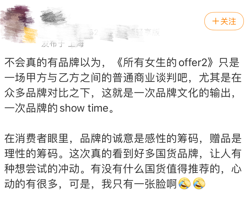 对于《所有女生的offer2》这档综艺来说,帮助品牌自身蓄积,借助节目推波助澜,利用产品硬核说话,共同打造最佳产品机制,并实现利益最大化宣传营销,才是节目最好的宣传方式。