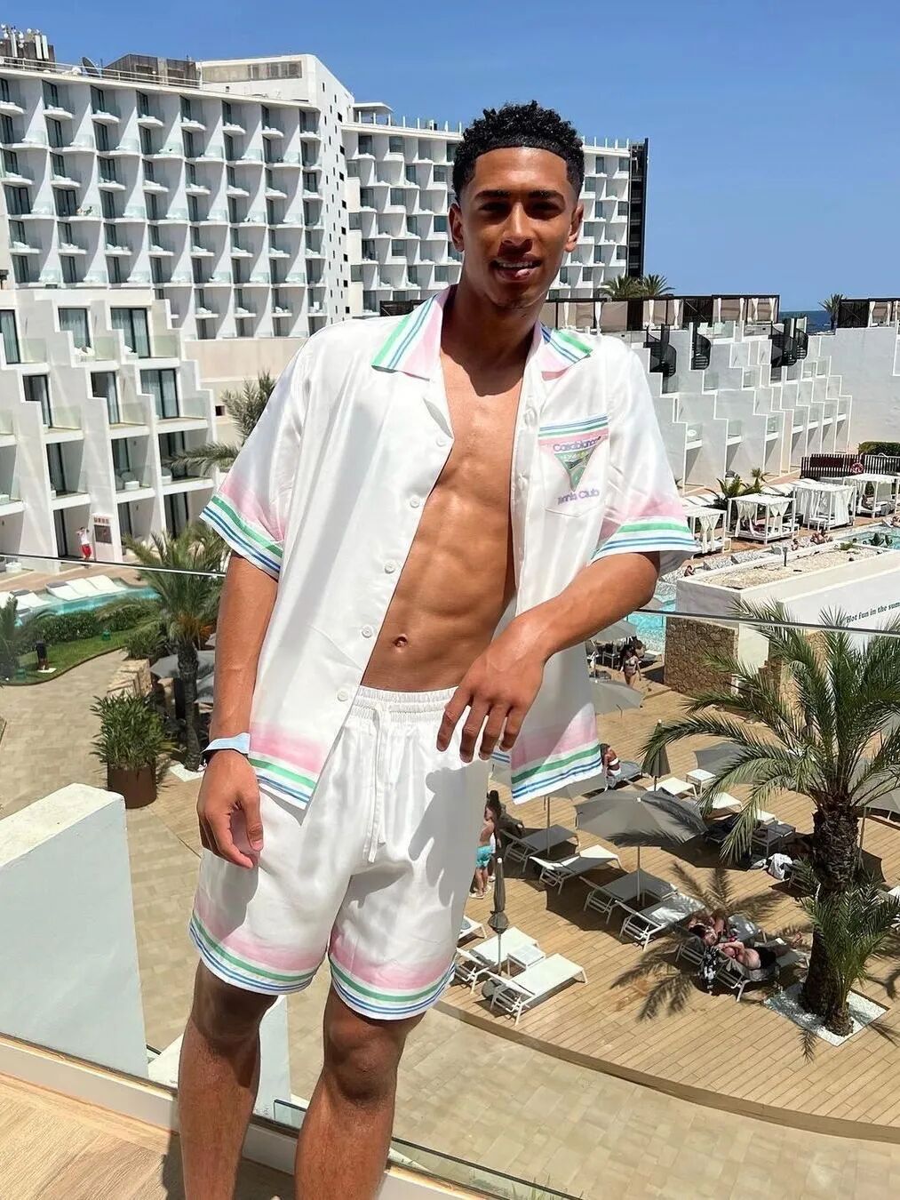 贝林厄姆、桑乔则是「进阶选手」了,穿上充满夏天气息的衬衫套装,敞开的衬衫露出了八块腹肌,这点小心机实属拿捏住了。