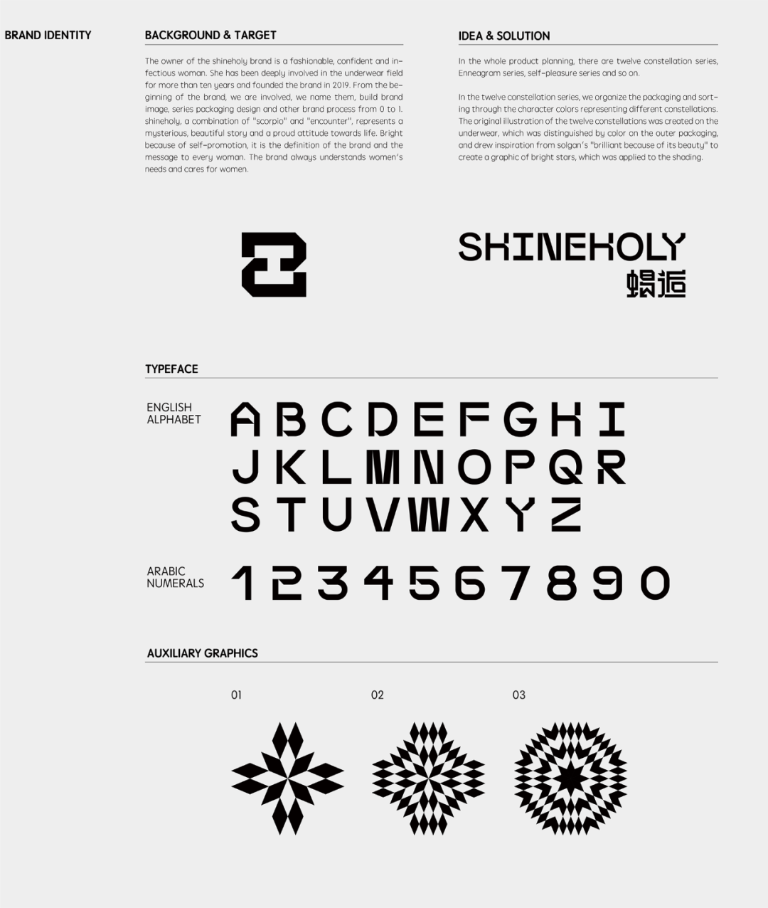 Shineholy 蝎逅品牌的主理人是一位时尚自信且颇富感染力的女士,她在内衣领域深耕了十多年,于2019年创立这个品牌。从品牌伊始,我们就参与其中,我们为他们命名,打造品牌形象,系列包装设计等品牌从0到1的过程。Shineholy 蝎逅,是“天蝎”与“邂逅”的组合词,代表一种神秘的,一段美丽的故事,又有一种高傲的生活姿态。因自华而璀璨,是Shineholy对品牌的定义,也是对每位女性的寄语。品牌始终理解女性需求,呵护关爱女性。