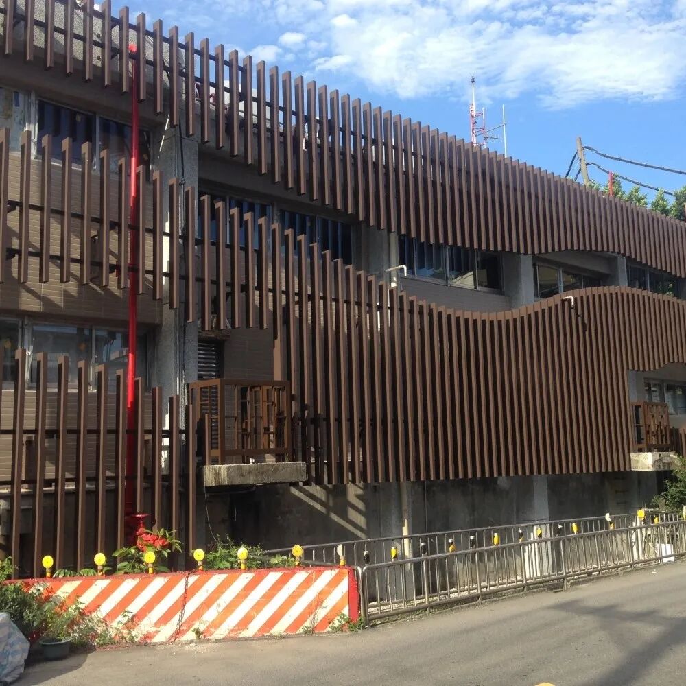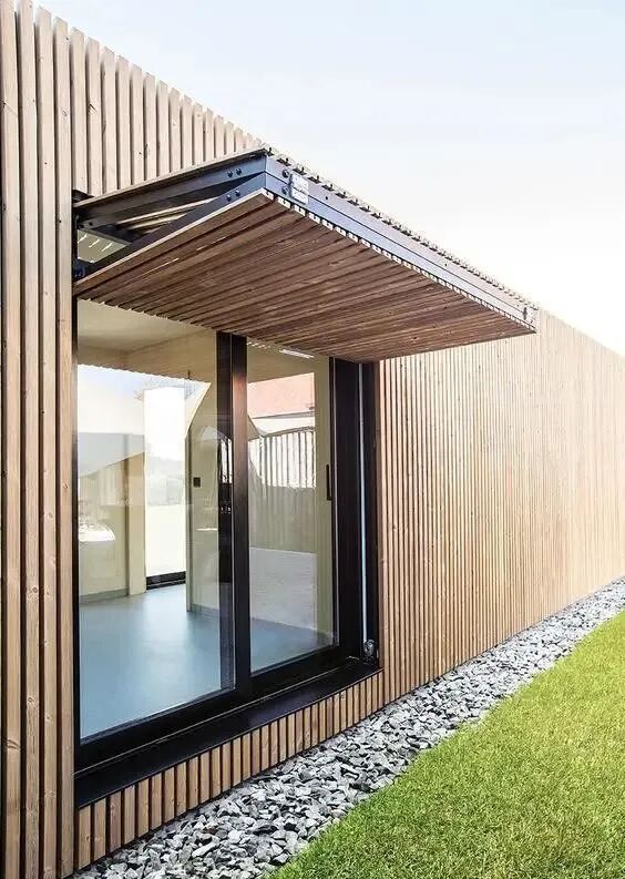 木质格栅用在室外与大自然非常融洽,让整体的建筑更自然、亲切,一般在室外采用的都是防腐木材。