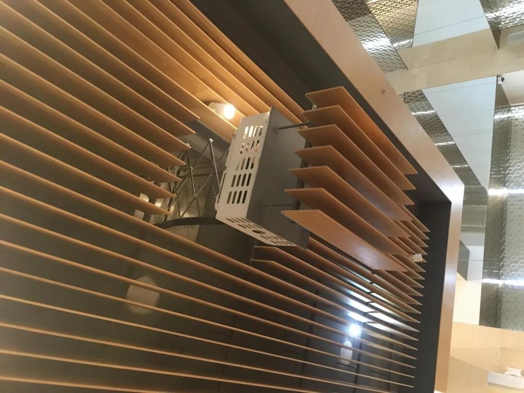 设备隐藏做法,如下图所示设备底部固定金属板,吊件龙骨格栅与之连接,投影设备升上去的时候,整个格栅吊顶依然是一个整体。