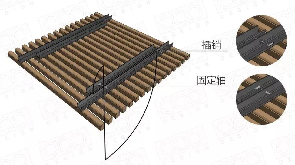 格栅与平顶相接的时候,如果用通常的固定方式和平顶会产生空隙,侧边也容易看到连接件不美观,这时候以隐藏式的挂扣方式,使天花整体美观。