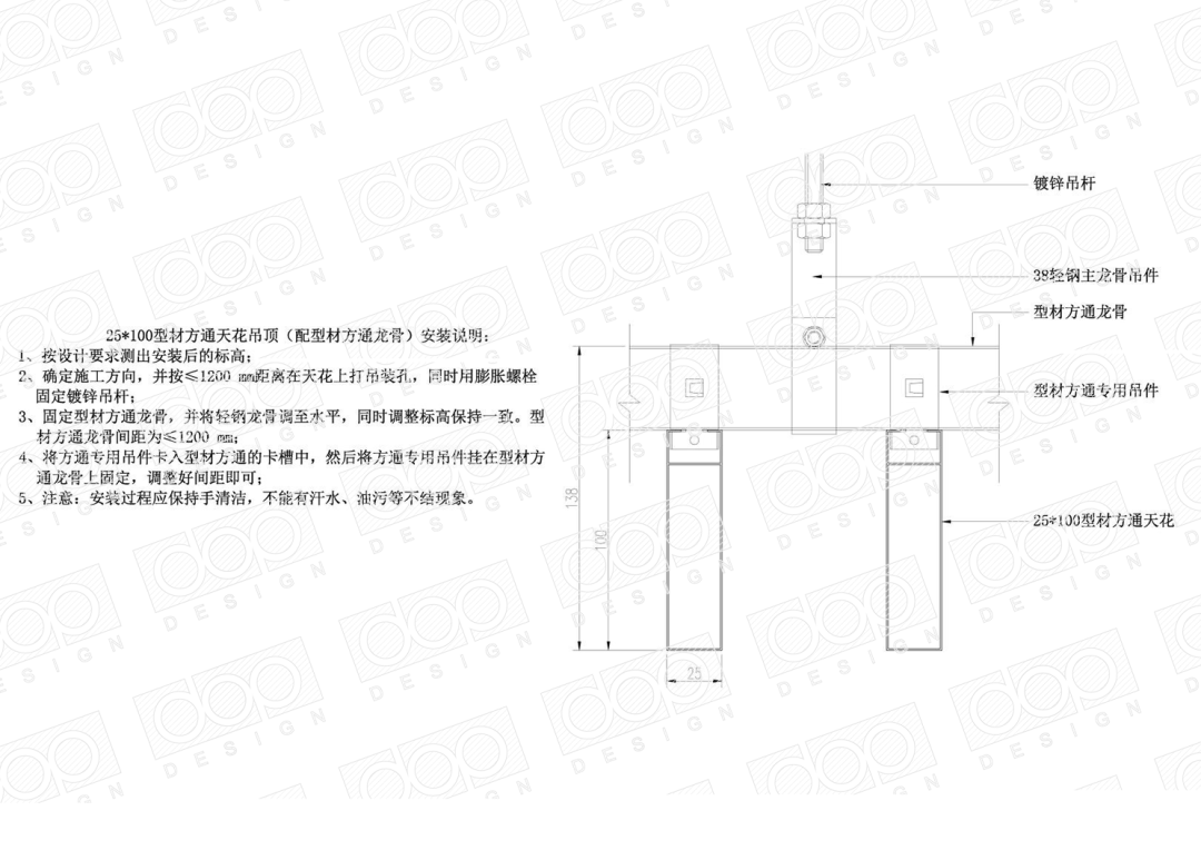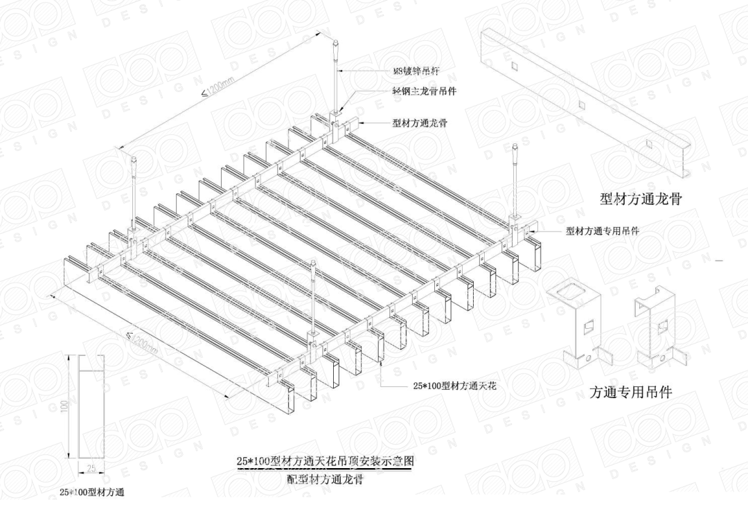 ① 吊杆+吊件+主龙骨+专用卡扣吊件+型材方通