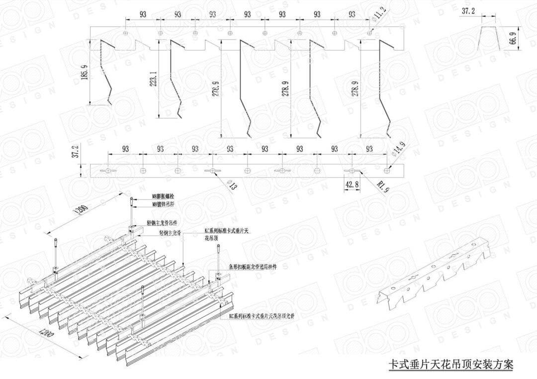 ① 吊杆+吊件+主龙骨+垂帘龙骨+垂帘天花