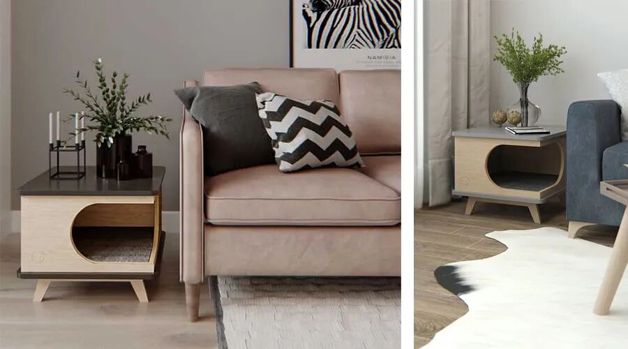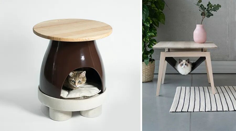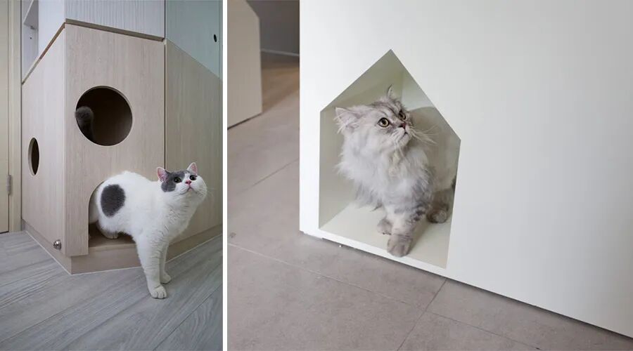 宠物作为家里的一员,所以在设计上我们尽量把宠物习居融入到室内人类使用家具中,由于宠物会磨牙、魔抓,所以在家具选用中我们尽量避免昂贵、不可修复的材质,考虑可拆卸,易清洗,不易破坏类的材料,家具表面应尽量光滑,密度较大,不易藏菌,颜色选择避免宠物的毛发脏乱显而易见,可以更好的融合人与猫对家具使用功能的需求,让主人与宠物和谐相处,又有彼此空间。