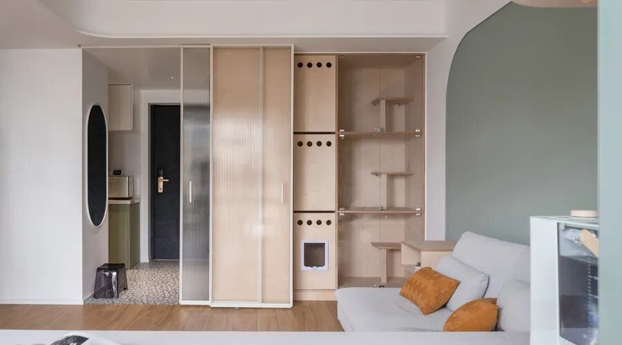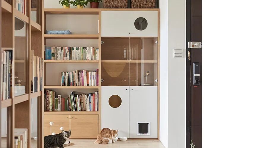 储物柜一定要设置门,使物品处于封闭状态,避免宠物对衣物、书籍和主人的心灵造成伤害,如果储物柜周围有足够的面积,我们可以在通向柜顶的方向设置隔板,给猫咪单独的空间也有效防止猫咪破坏储物柜,并且再也不用担心柜顶常年积灰。