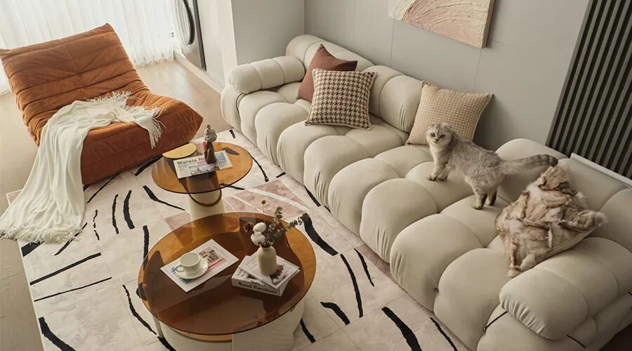 宠物的战斗力真是不容小觑,购买心爱的沙发假如是皮质或者棉麻质地,建议用好看的沙发搭毯做外层防护装饰。也可以在沙发上喷上一些带有味道的香水,降低宠物对沙发的兴趣。另外推荐养宠物家庭买什么材质呢?市面上有专用的宠物面料可以选用,也可以选用绒布的面料。