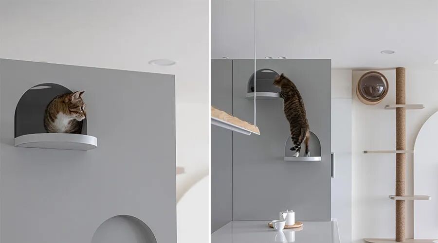 饲养猫咪的家庭在设计上要遵循猫咪天性好动的习性,不要形成圈养模式,而是主张释放天性,在有限的空间中为主子建造一个属于他们的猫咪乐园。
