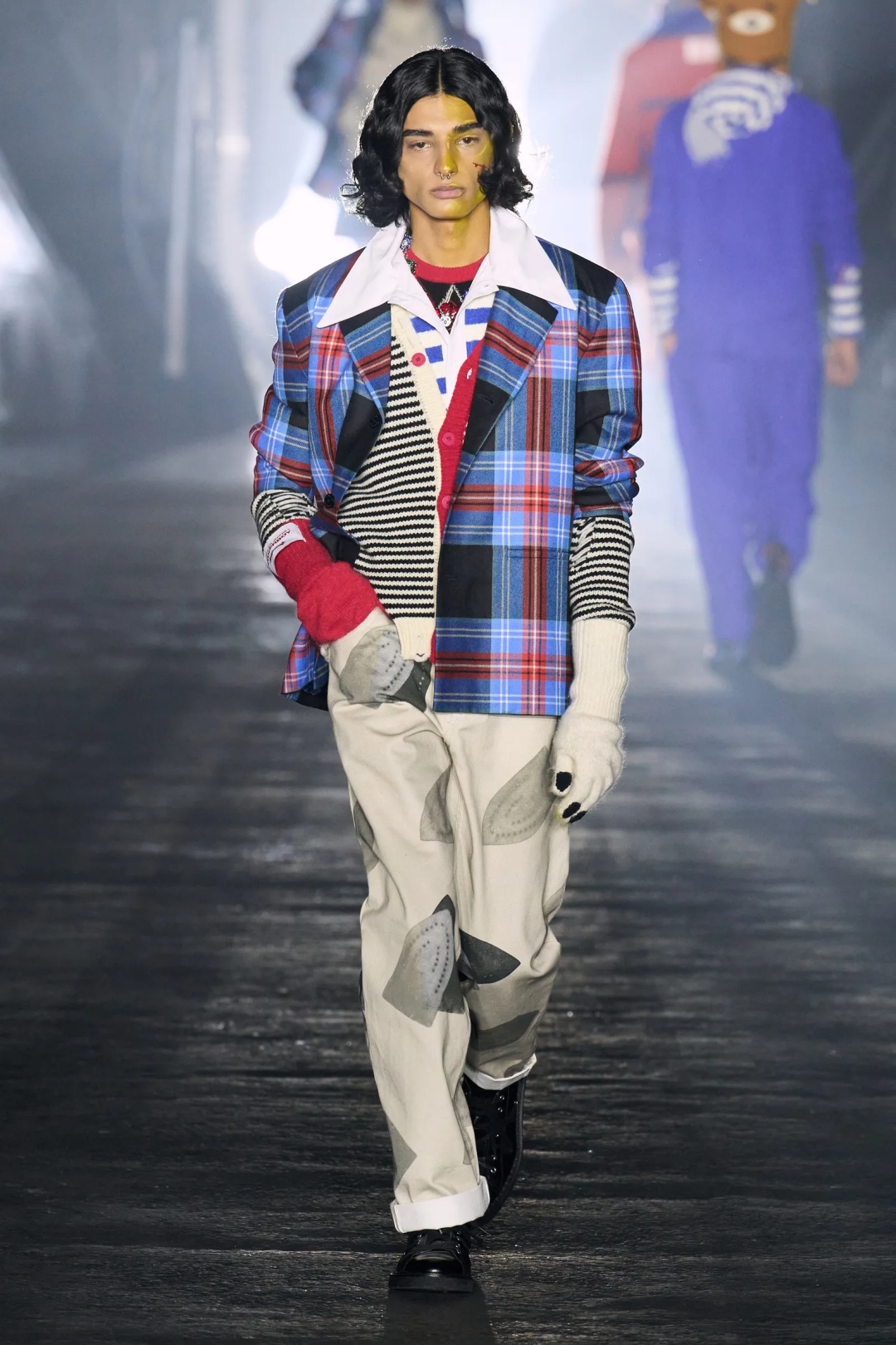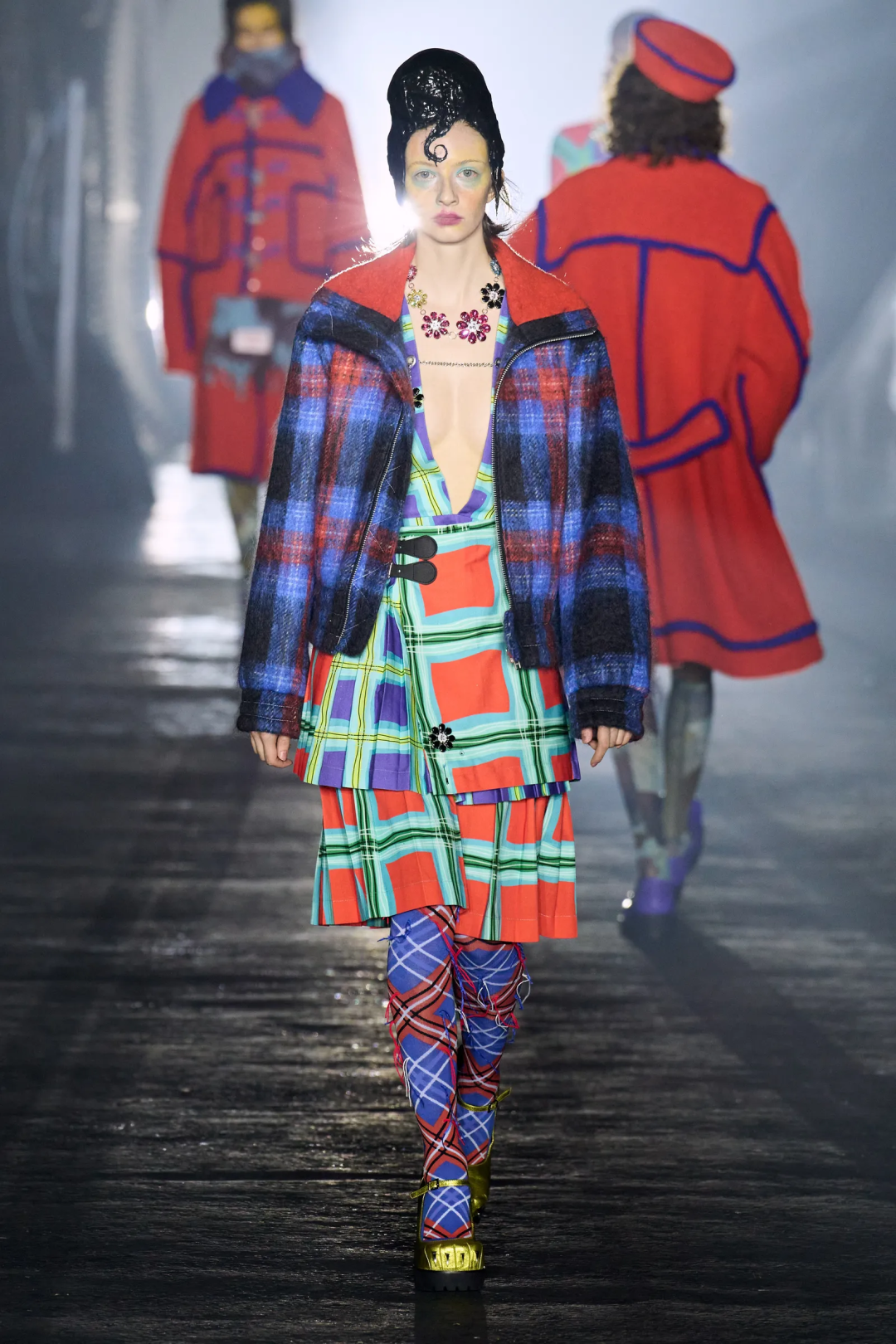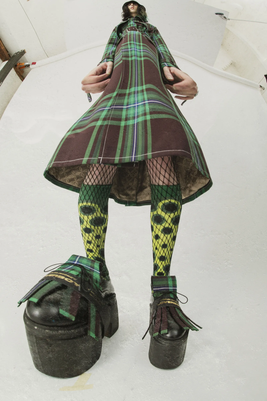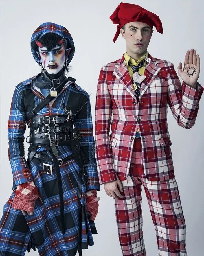 紧接着是装腔作势者,明亮的格纹印花,搞怪的格子呢,爪形鞋,光面皮裤,艺术画装饰的外套。模特们衣着华丽,脸上画着怪异的妆。