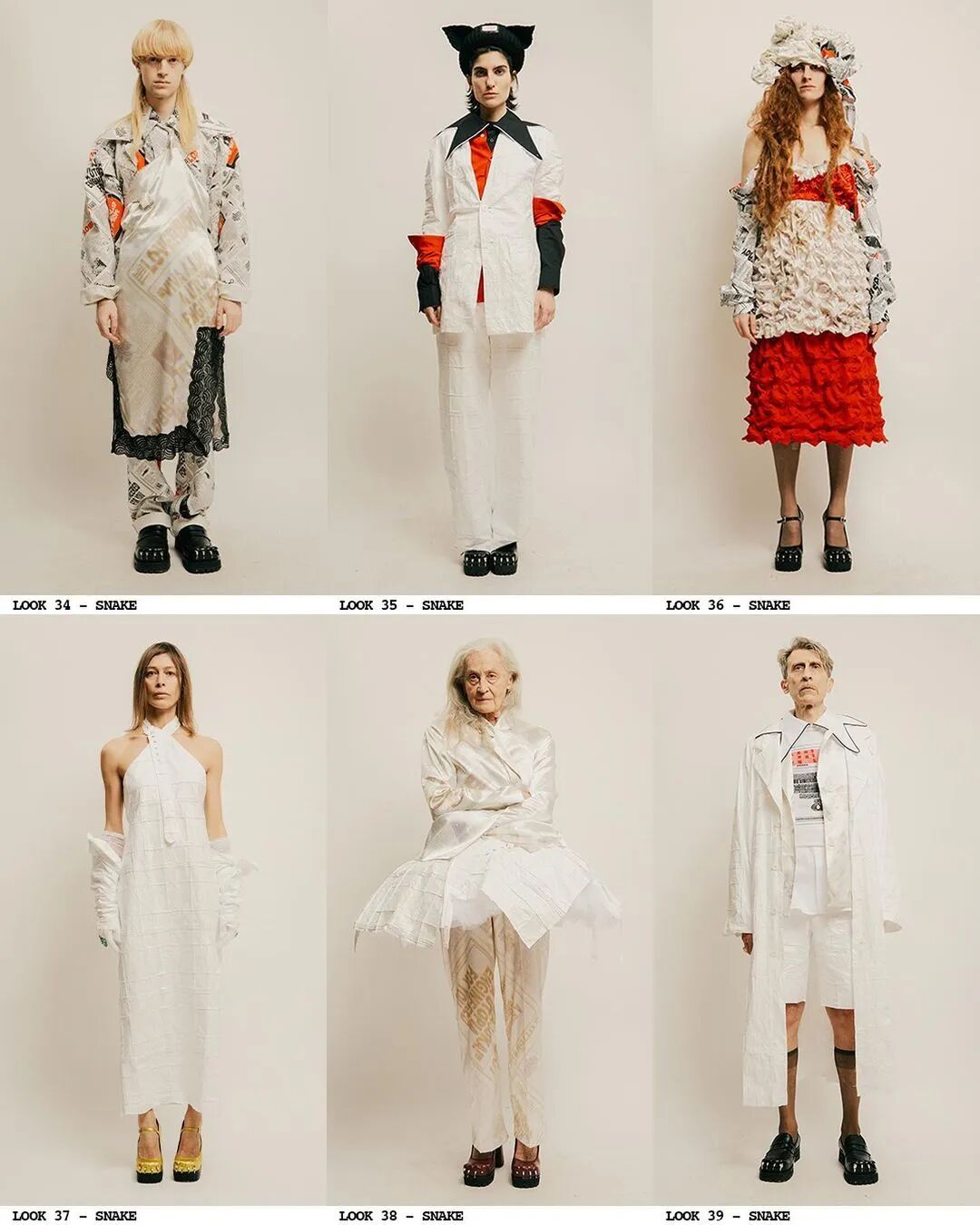 “蛇”的灵感来自报纸,他们热衷于传播各种新闻,像蛇一样在各个地方窜来窜去。于是,设计师把报纸元素做成了各种单品,衣服、裙子、头套。