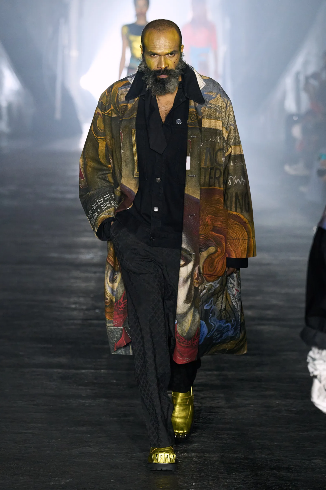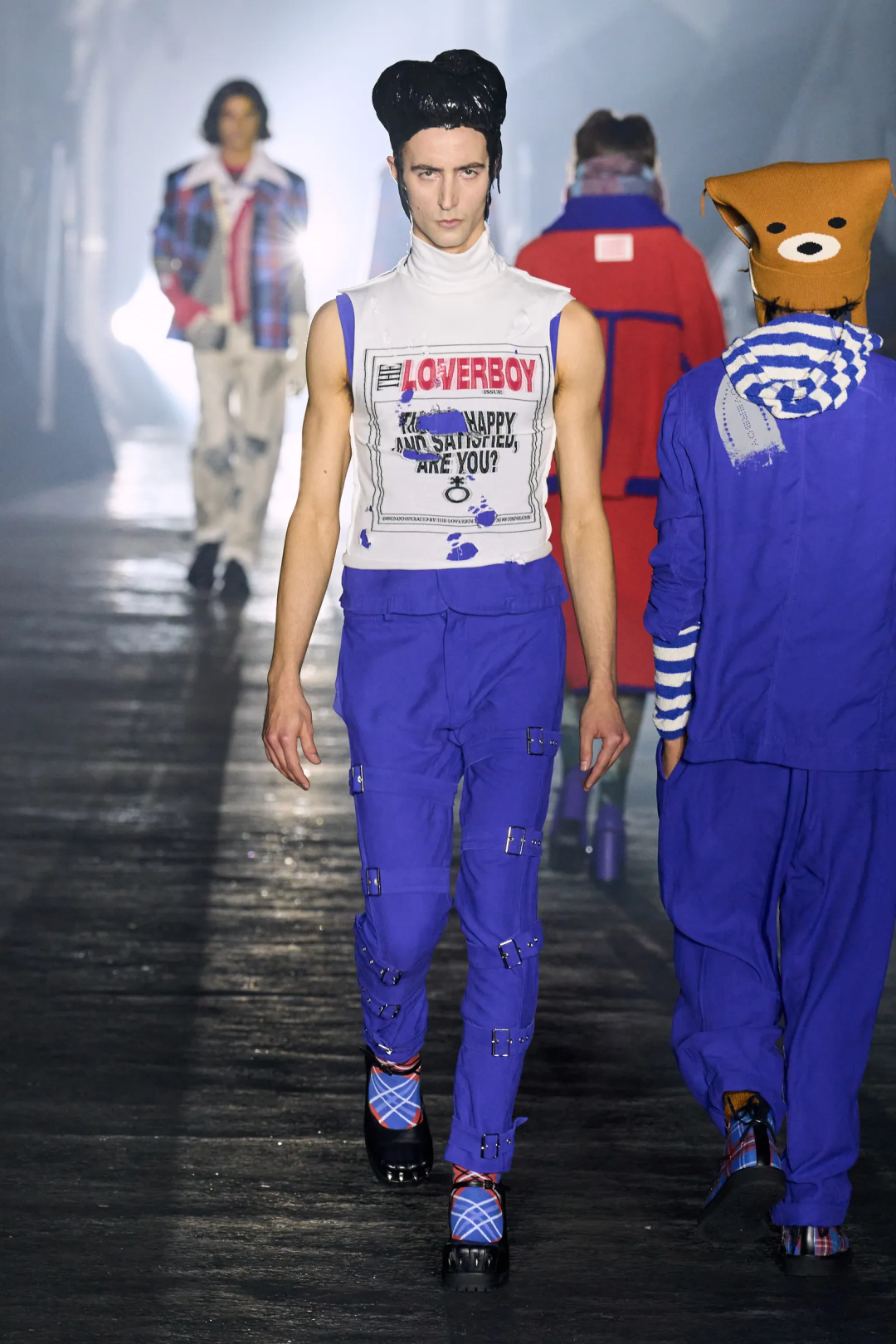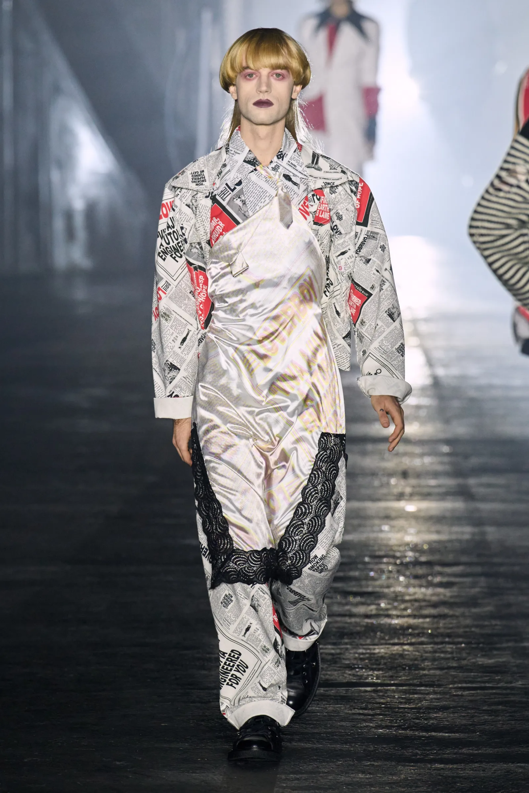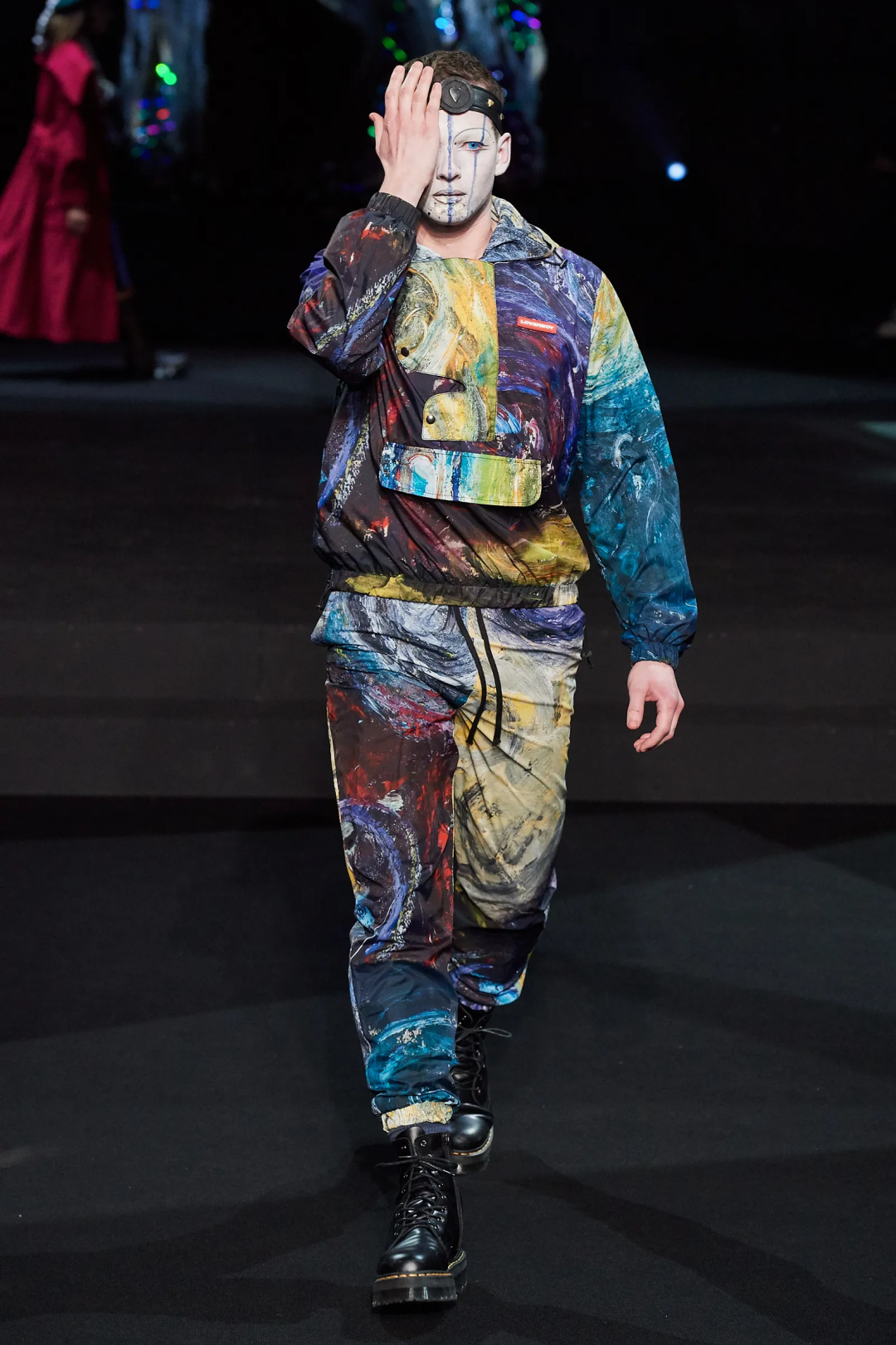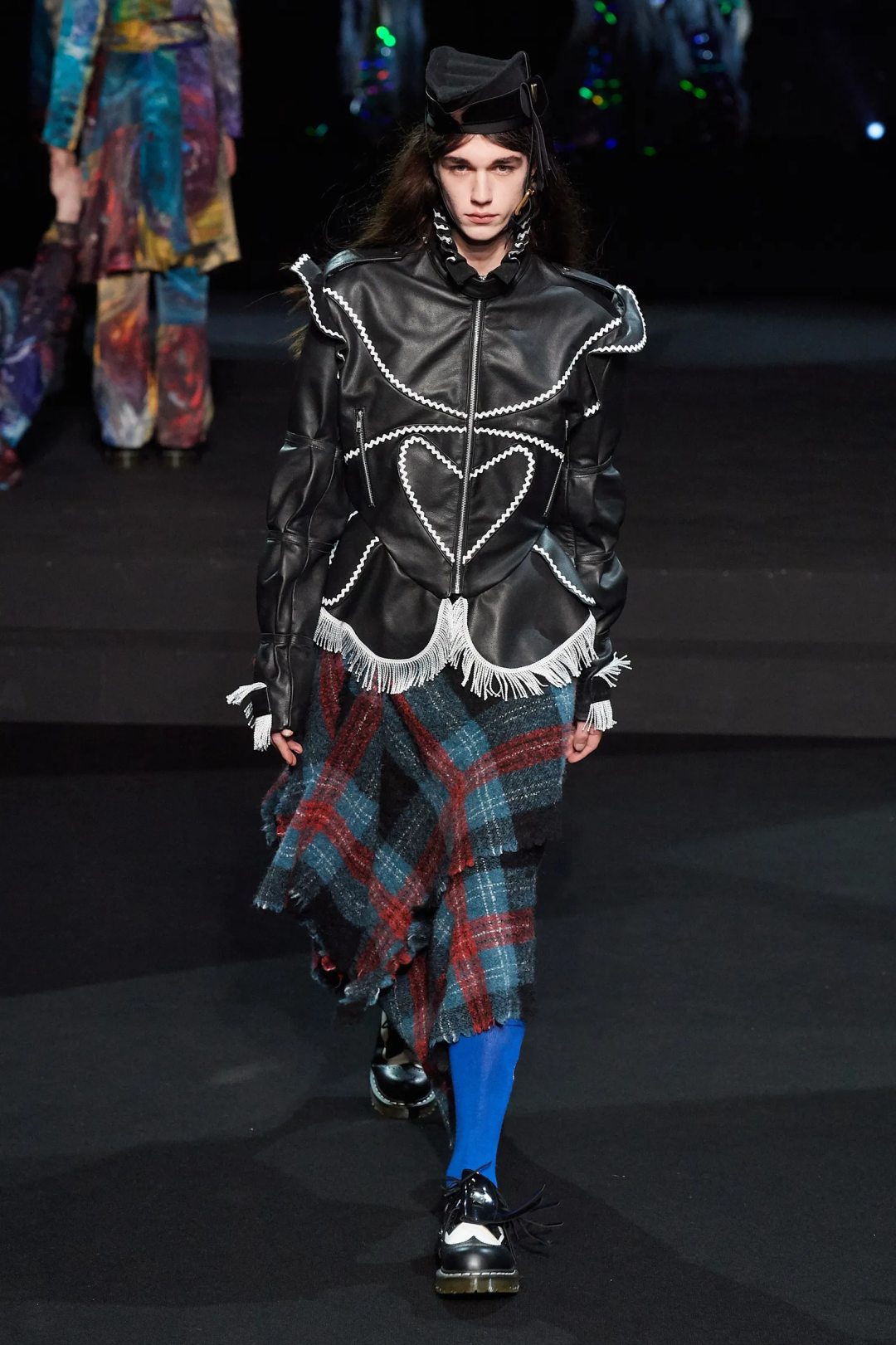 受艺术家约翰·伯恩1987年作品《The Slab Boys Trilogy》的启发,Charles Jeffrey将秀场打造成了工业引擎室,将作品中的现实主义、讽刺主义带到了秀场。
