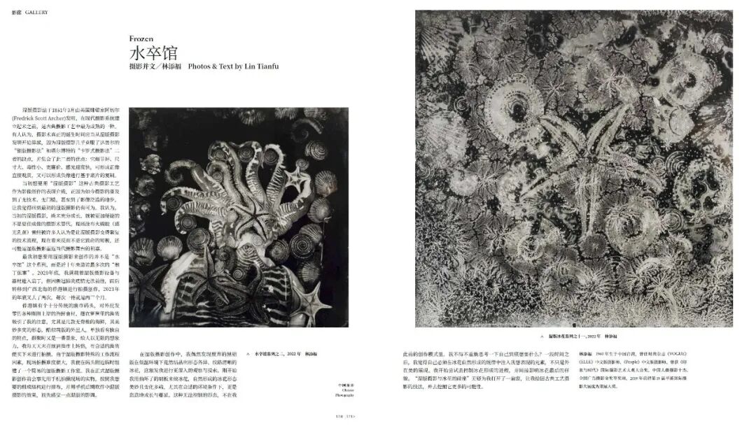 摄影师林添福以湿版摄影的方式拍摄下渔市码头中形态多变的海鲜食材,同时在湿版创作中又发现了黑铝版在低温环境下可以结晶出形态各异、纹路清晰的冰花,他将两种元素结合,于是就有了作品“水卒馆”。