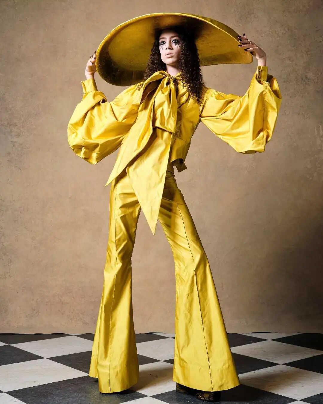 比如,以维多利亚时代和爱德华七世时代的轮廓为参照,结合来自Oscar Wilde的影响,Harris Reed呈现出了喇叭裤、荷叶边上衣、女式帽子等中性化的浪漫设计。