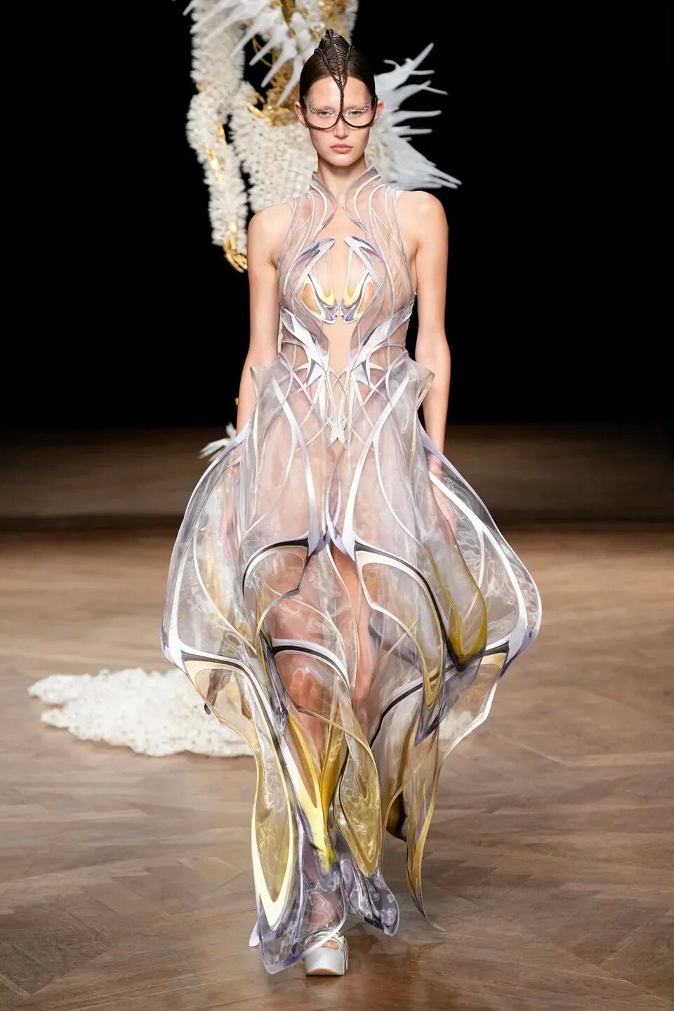 无论从工艺还是技术的角度,Iris van Herpen的设计都生动诠释了高级定制的艺术,本季也不例外。以「元形态论」作为此次高定秀场的主题,环绕着秀场中央的Daphne动态雕塑,时装展示在现实与虚拟中穿梭。