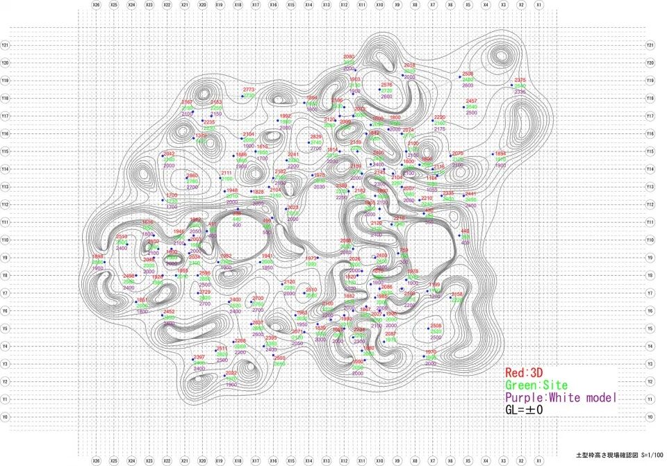 施工人员将经过无数次修改的体量模型转换为三维数据,利用导航系统确定出打桩点。施工人员不断确认桩柱的位置和形状,并辅助以人工挖洞来保证精确程度。