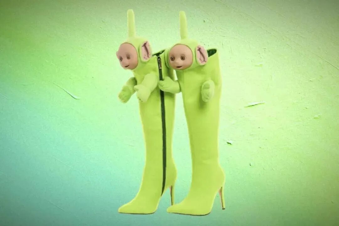 此次联名系列中最为吸睛的便是一双荧光绿过膝长靴,该鞋款以《天线宝宝》中的角色Dipsy为灵感设计,包括保留Dipsy的脸、耳朵、双手与头上的天线,直接掀起了网络上的火热讨论。除了长靴外,Christian Cowan也为其他天线宝宝打造出T-Shirt、连帽衫、牛仔裤和丹宁外套等单品,四位主角皆有出镜,以此致敬这部足以代表90年代流行文化的经典卡通。