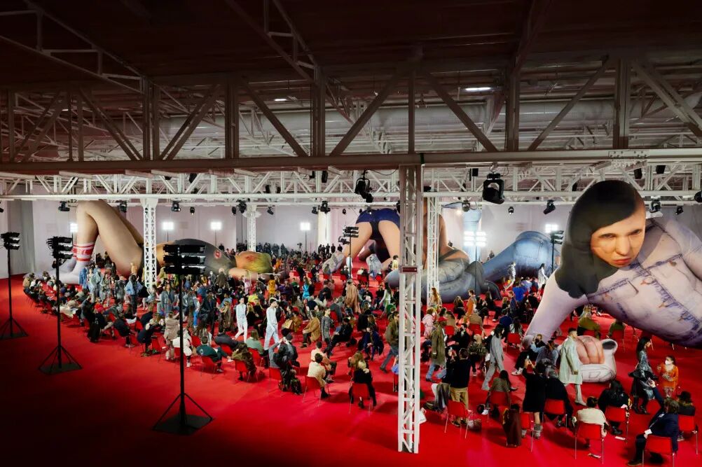 上海快闪活动中饱受争议的巨型人偶装置便来自2022秋冬系列大秀。这场秋冬大秀也是Glenn Martens接任DIESEL品牌创意总监后发布的首场线下时装秀。