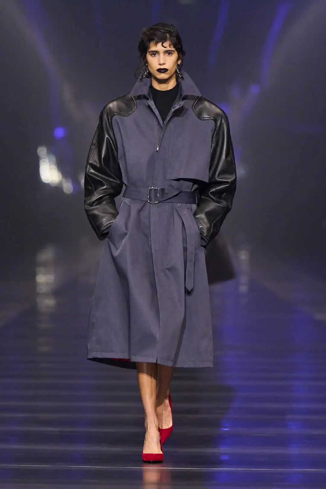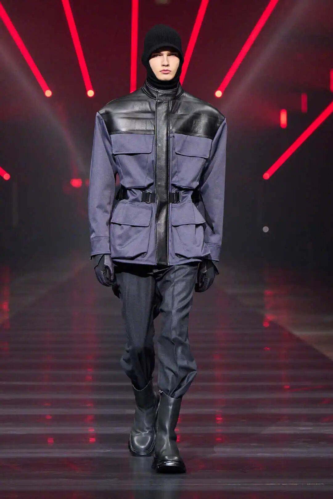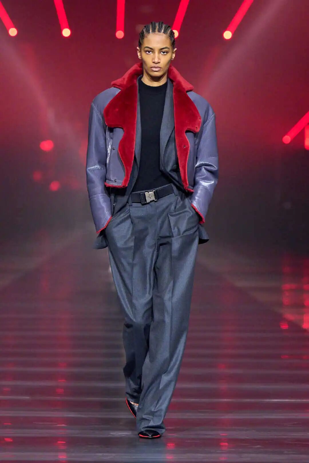 Rocco Iannone这次以品牌IP为出发点。其汽车内饰面料经过调整在西装上使用,以驾驶员和维修人员的制服为蓝本对其进行了修改,包括肩部带有防护盔甲的夹克和光滑的皮革或丝绸赛车工作服。