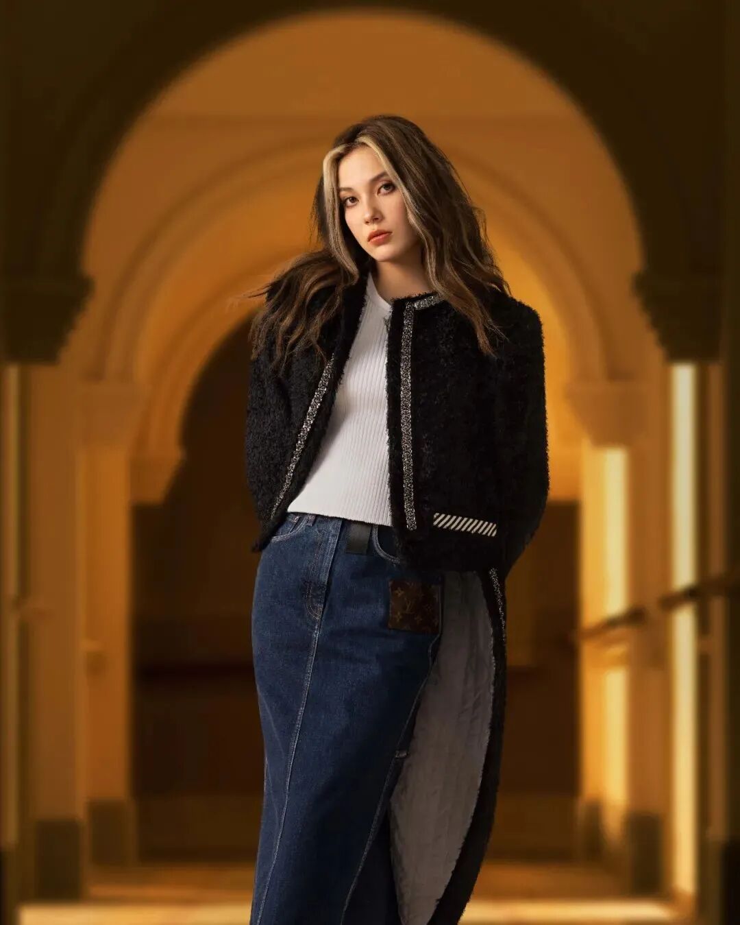 当然,在这些冲锋衣和机能外套之下,Ghesquière为女孩们准备了兼具复古华丽与现代的廓形感裙装,从胸前顺势也下,在腰前撑起沙漏般的体积感,再延伸至腰部两侧,以精炼的线条构建出多维度的立体造型,游走于历史与未来之间。