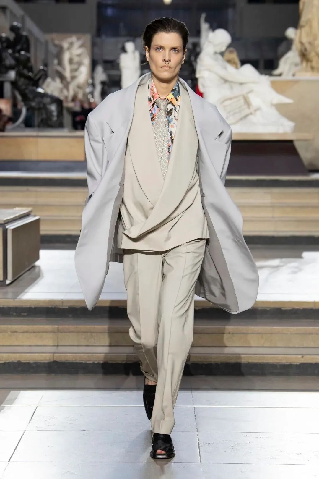 而即便是将双排扣大衣与西装叠穿的经典造型,Ghesquière也不想在年轻人的身上轻易下结论,把传统西装上衣的版型放大,调整到恰到好处的休闲尺度,同时为合身的西装长裤挽起裤脚,配上彩色的领带、花衬衫,每一个小细节都在展现着年轻人的不拘一格,但只有走进她细细品味,才能感受到这种反差的玄机。