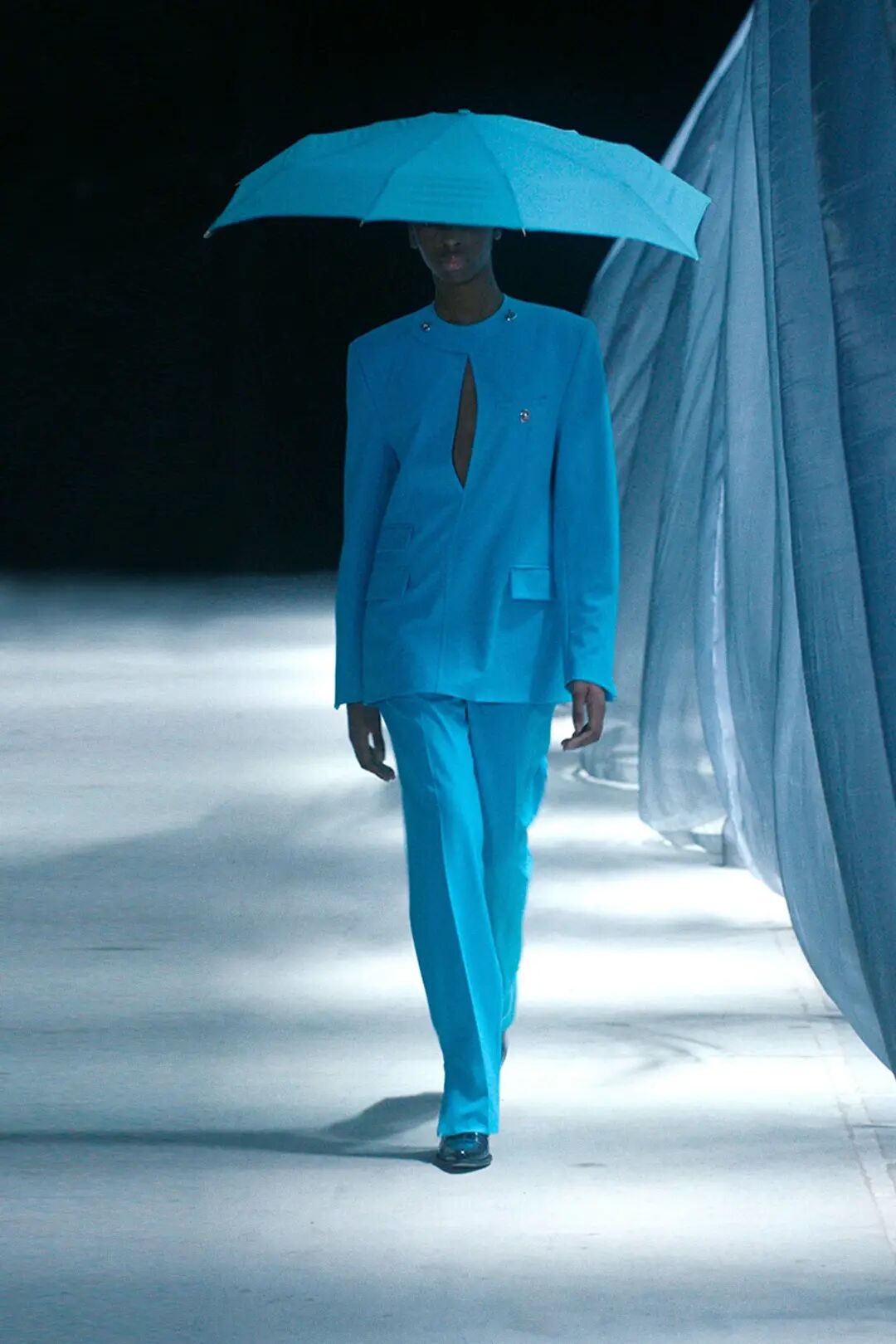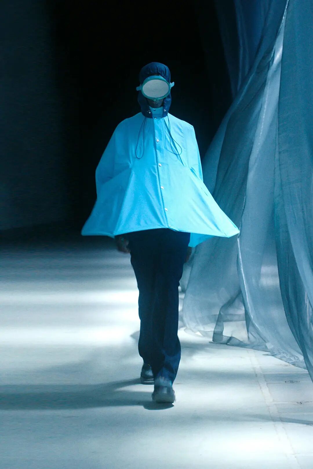 在2022春夏秀场中,他们联合非营利环境组织Parley For the Oceans,将污染海域中的塑料垃圾制成织物面料,一番材质的改造,便可实现海洋环境的保护。