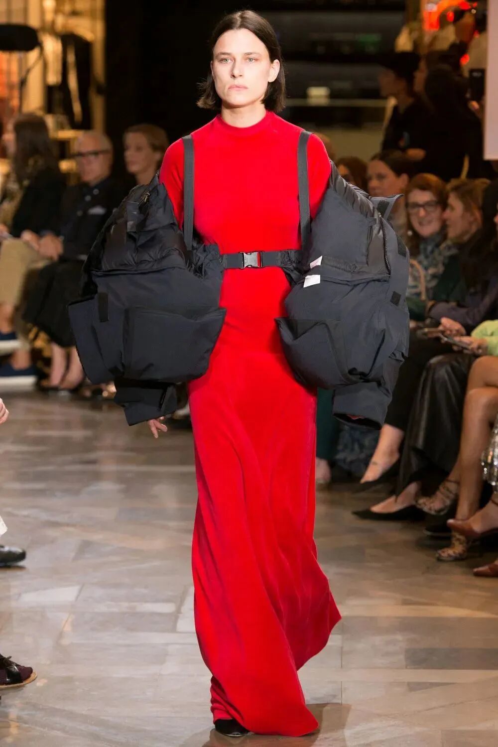 Demna Gvasalia在设计上采用宽大的连帽衫、强势却裁剪不规则的西装、紧身连体衣和犹如外星人双目的巨大墨镜。巨大的黑色垃圾袋则作为最受瞩目的配饰。当模特拎着这款名为Trash Pouch逆着风雪行走时,整个时装场景看上去极具讽刺意味。