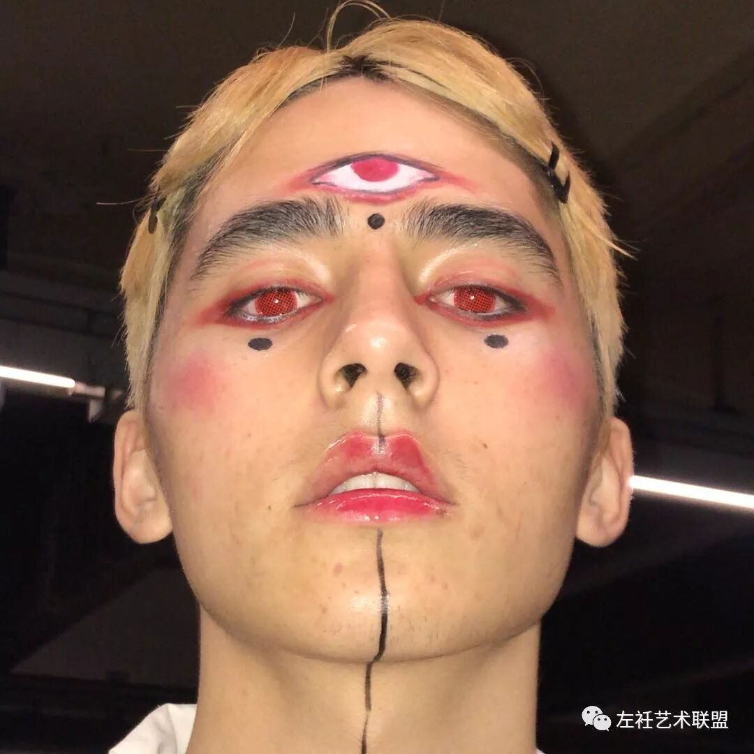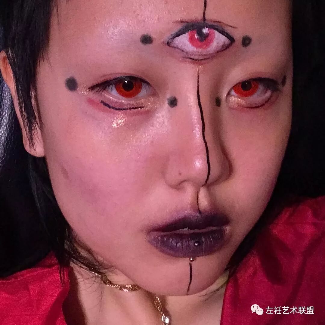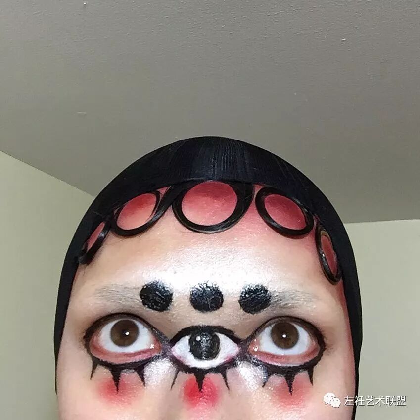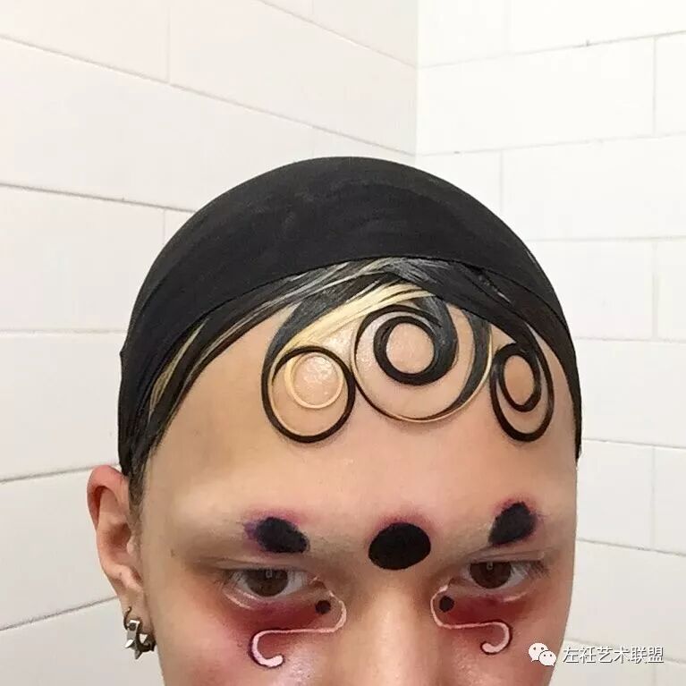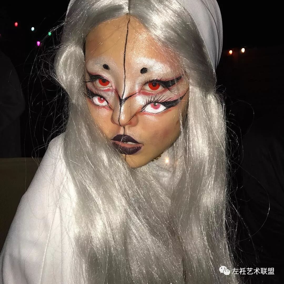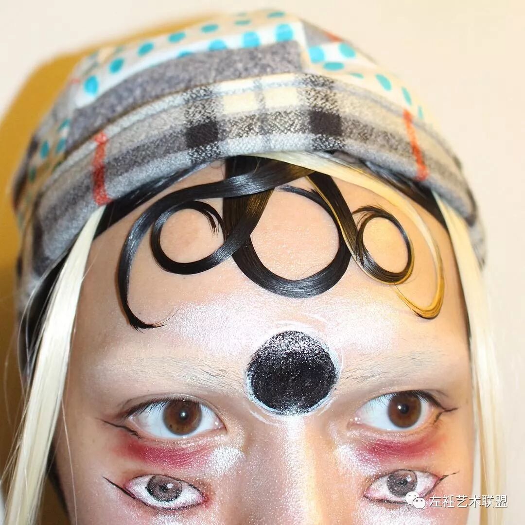 妆容的设计基本说日用品,比如白色眼线笔、液体笔和腮红,在真实的眼睛中创造出眼睛,用不同的附加品覆盖前额和脸颊,这很像是万圣节的一个习惯。