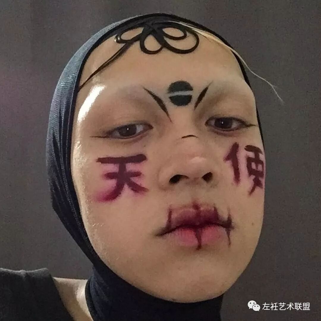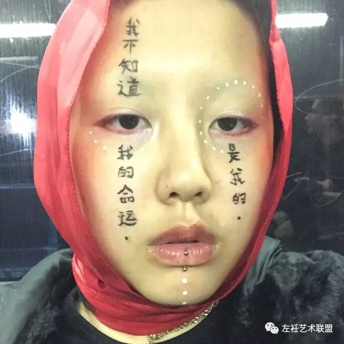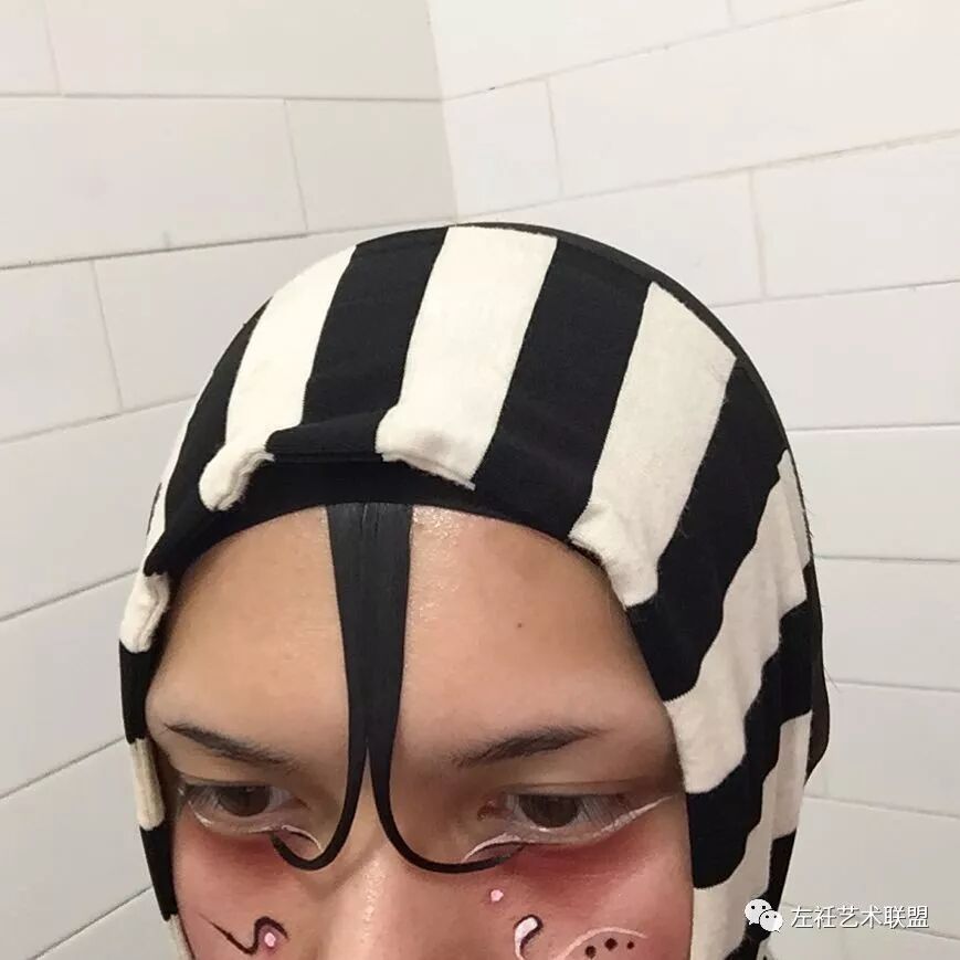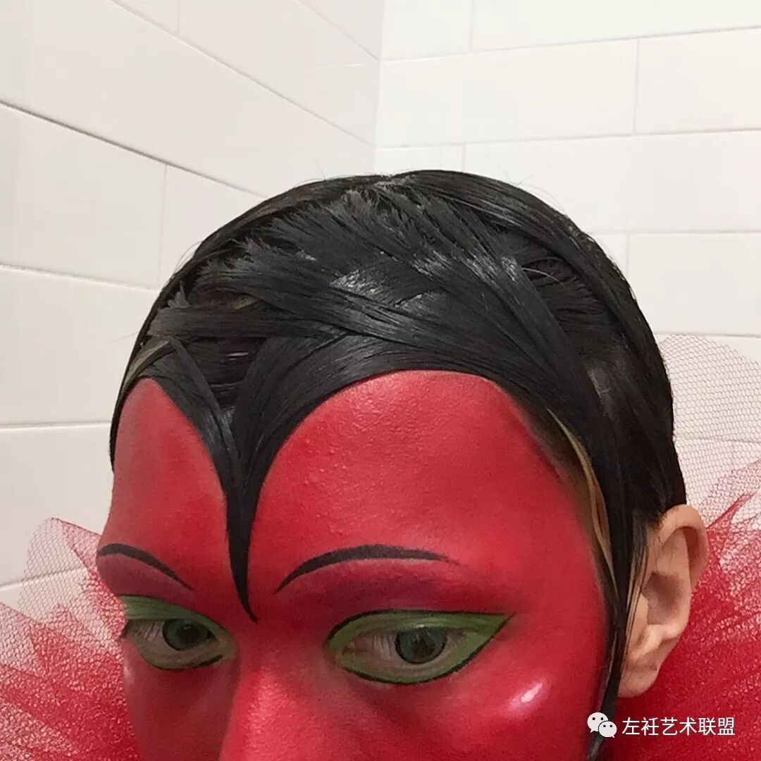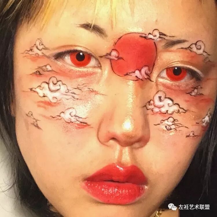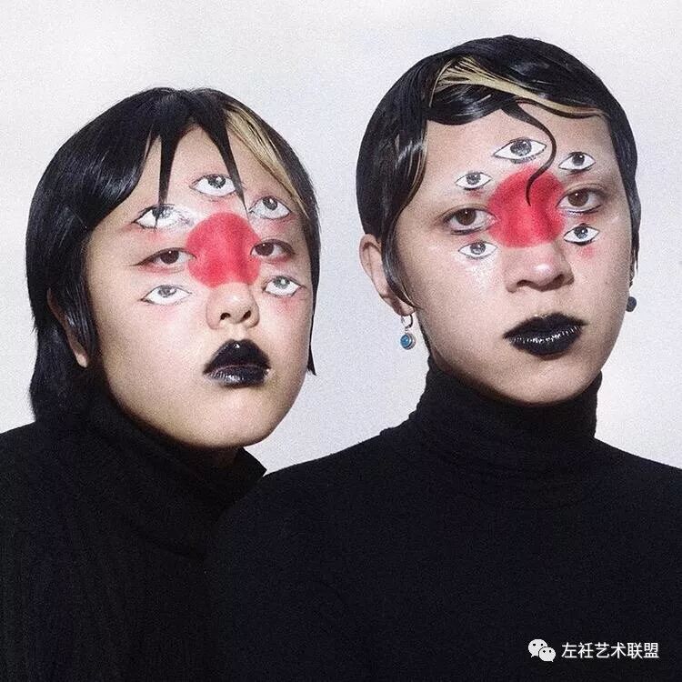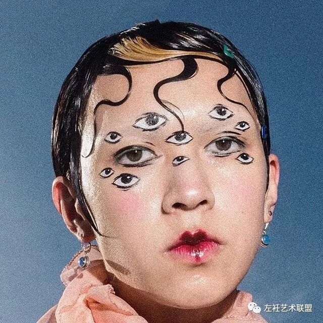 妆容的设计基本说日用品,比如白色眼线笔、液体笔和腮红,在真实的眼睛中创造出眼睛,用不同的附加品覆盖前额和脸颊,这很像是万圣节的一个习惯。