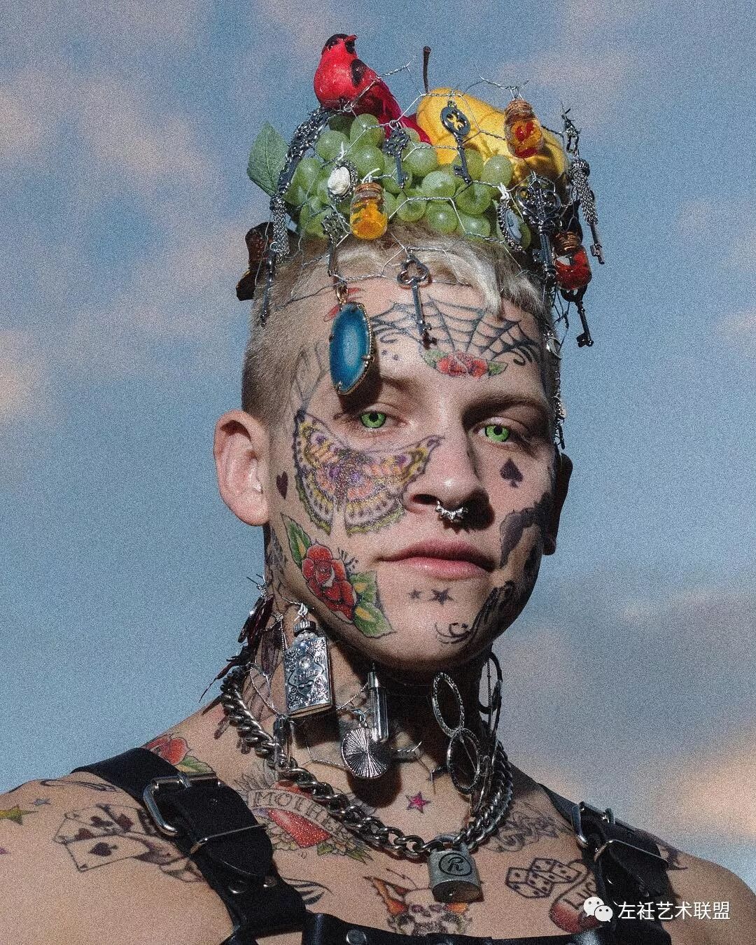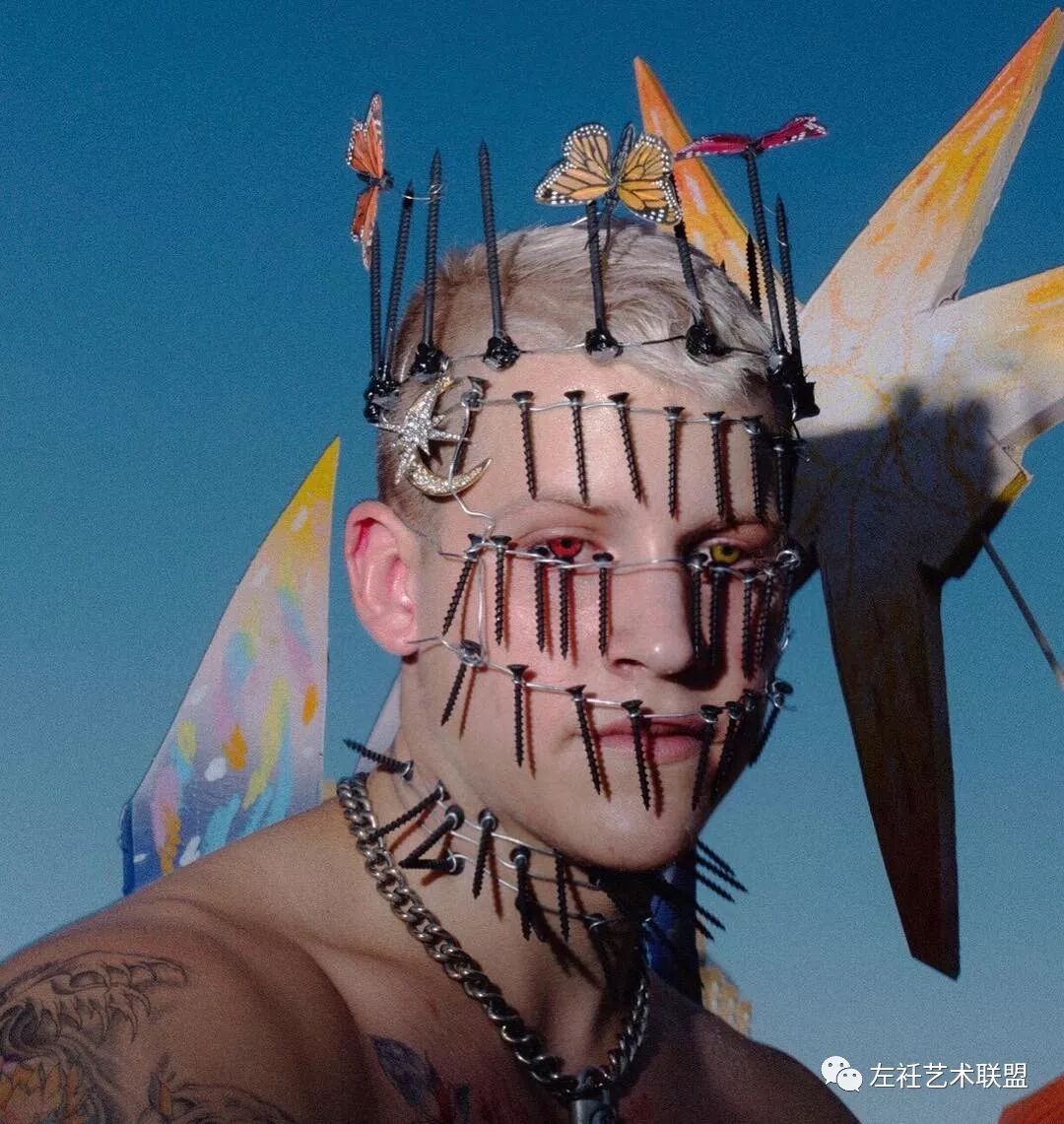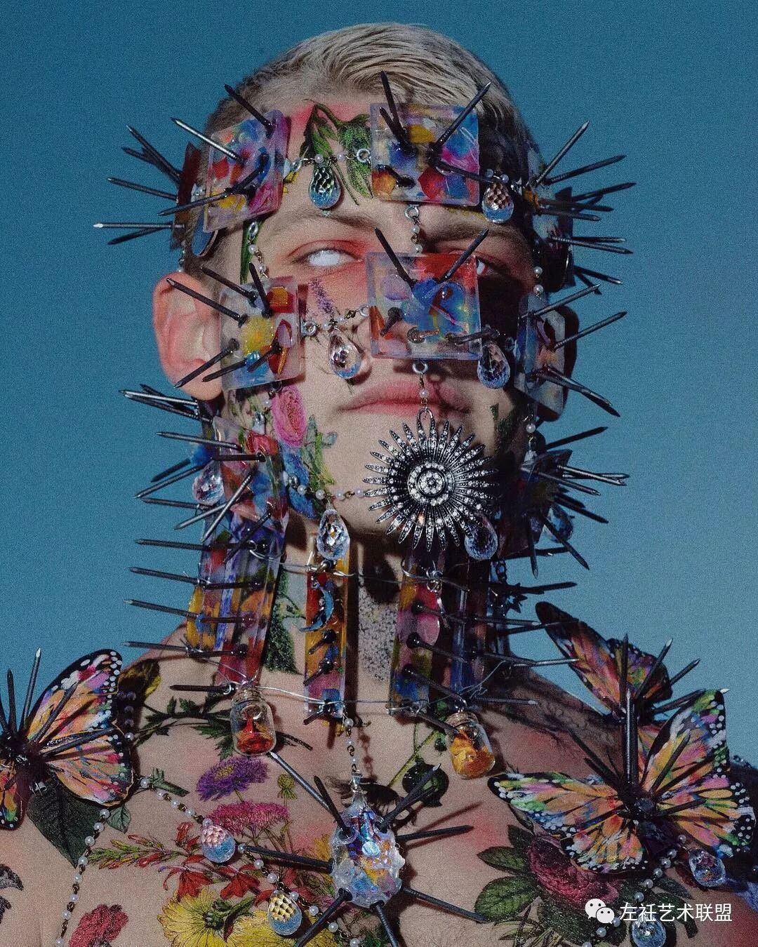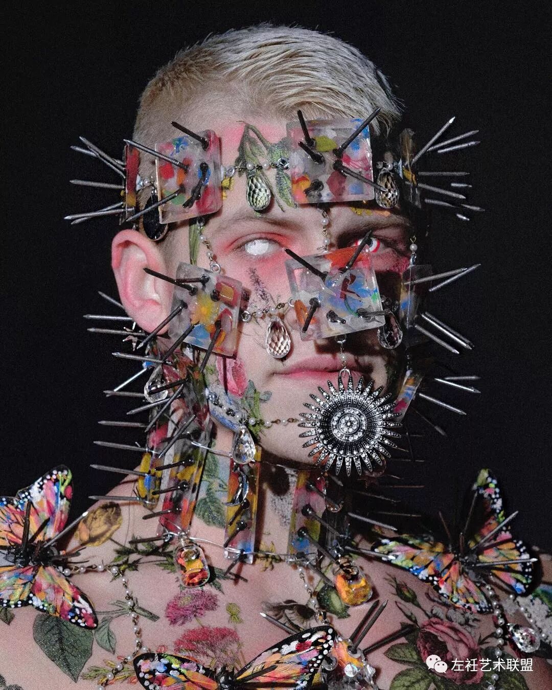 Cupids通过化妆,在自己的脸上加入了诸如钉珠、链条、蝴蝶、花卉、曲别针等形形色色排列组合成具象纹样的装饰物,镜头前显现的是一张张极具表现张力的艺术大片。