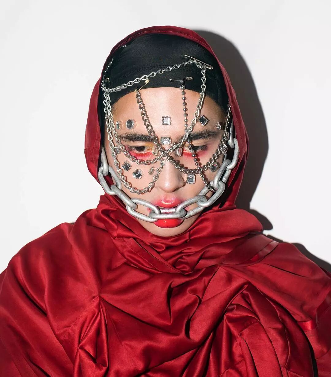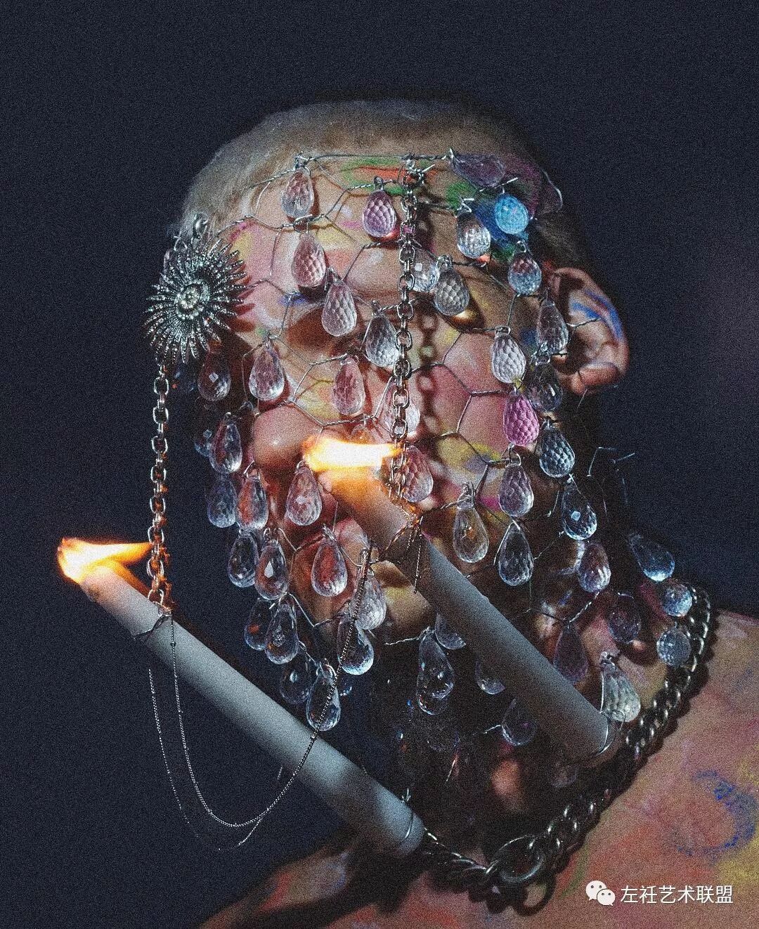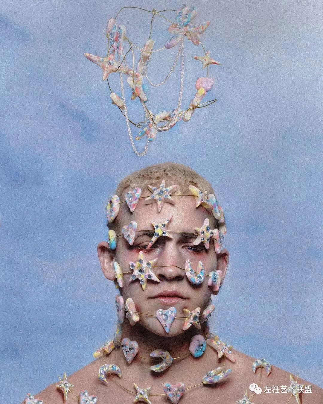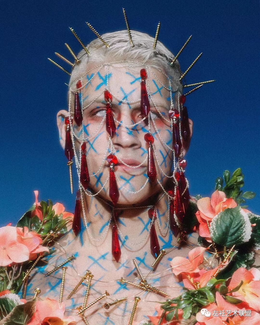 Cupids通过化妆,在自己的脸上加入了诸如钉珠、链条、蝴蝶、花卉、曲别针等形形色色排列组合成具象纹样的装饰物,镜头前显现的是一张张极具表现张力的艺术大片。