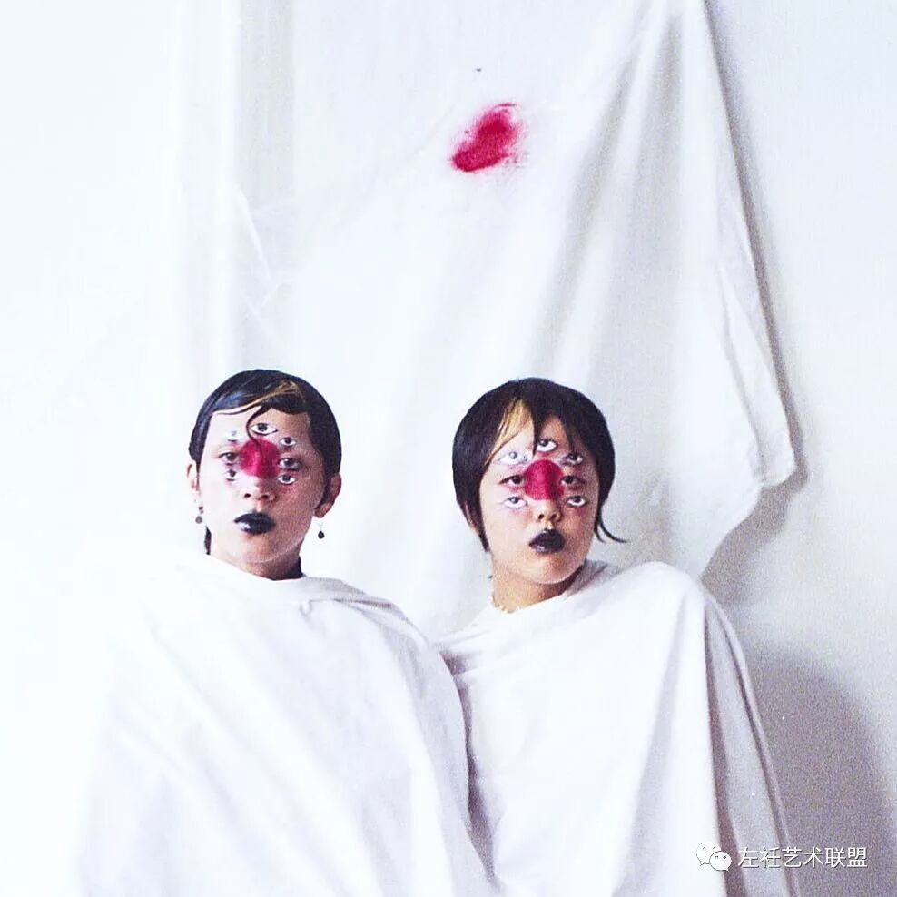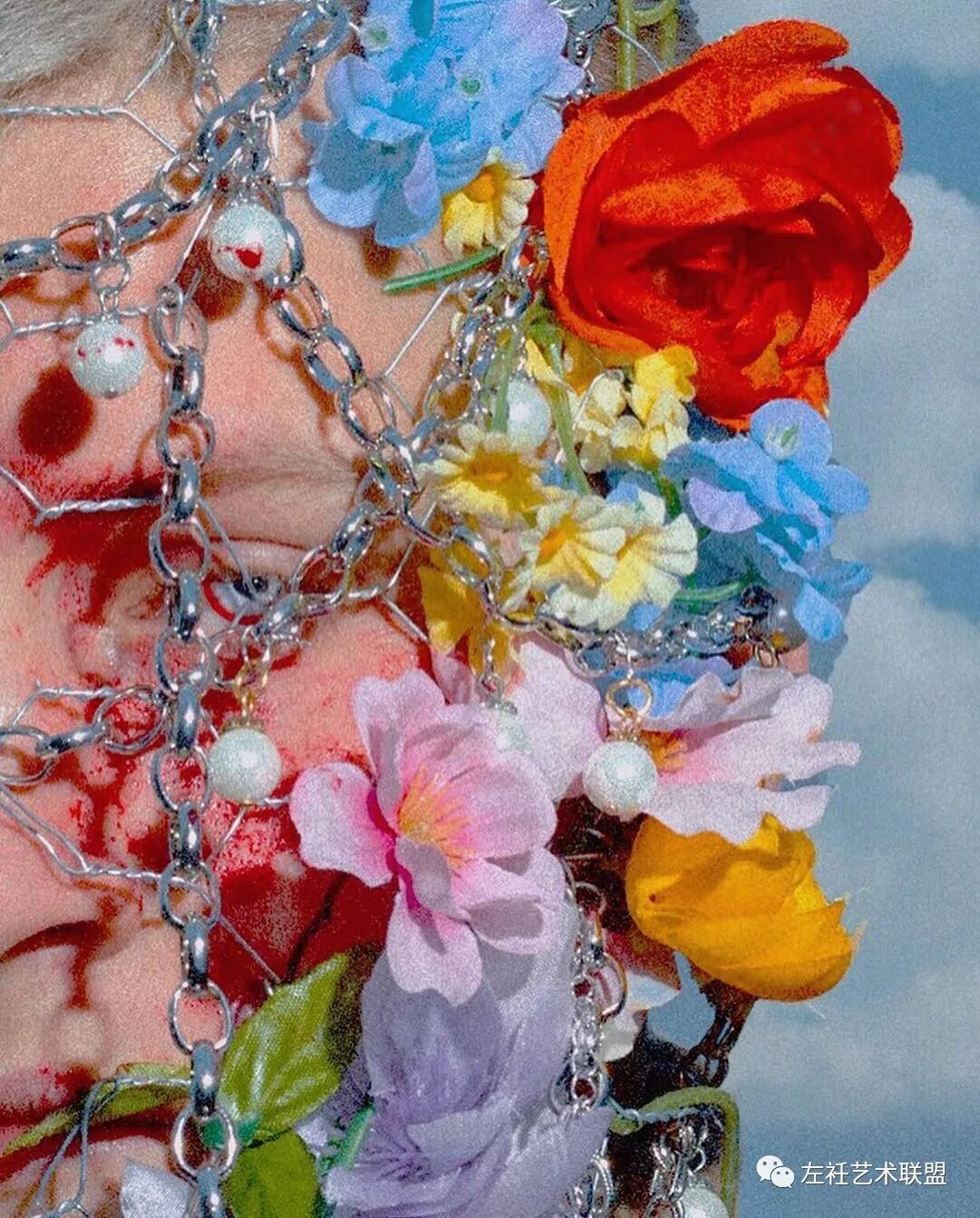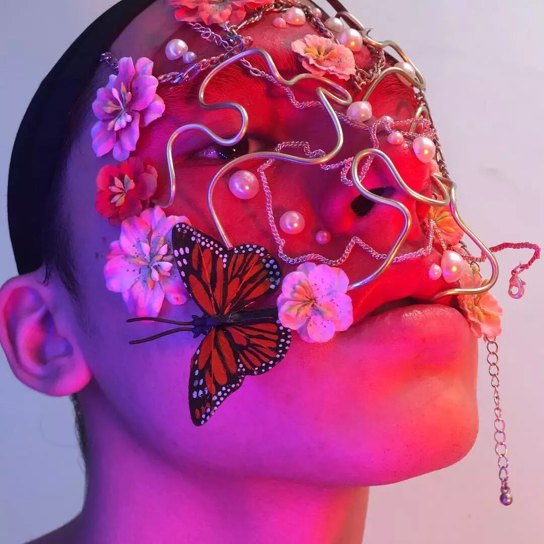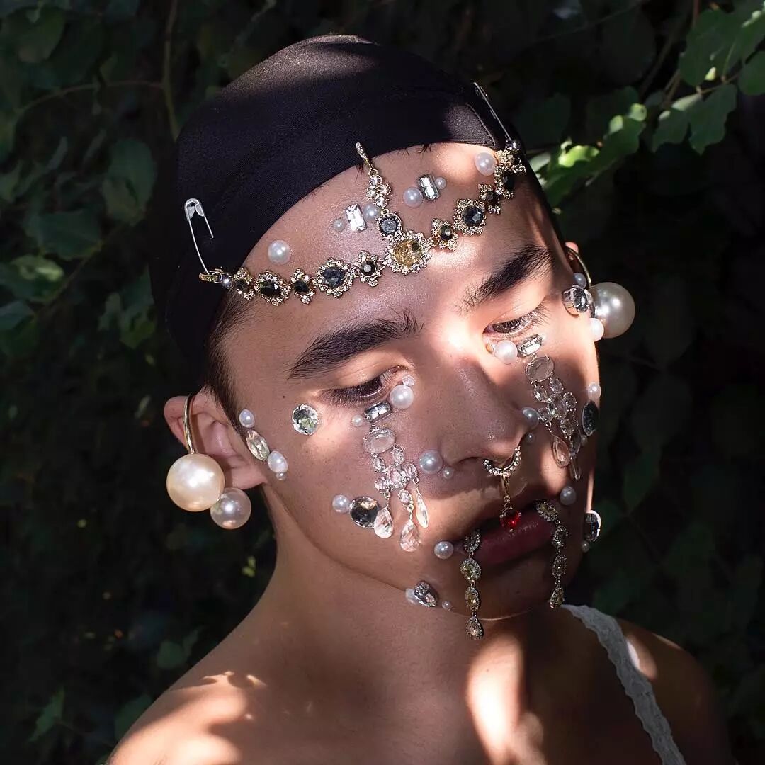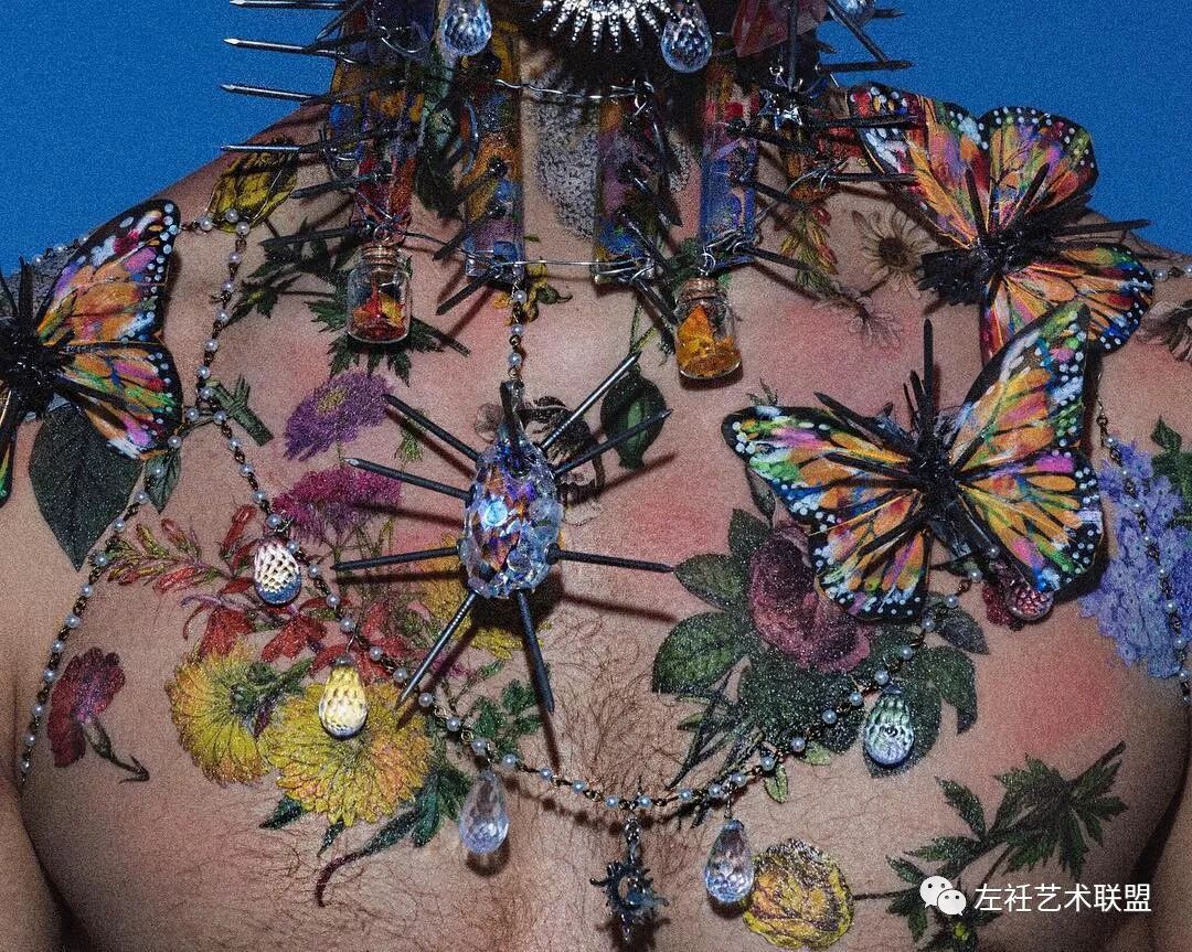 Cupids通过化妆,在自己的脸上加入了诸如钉珠、链条、蝴蝶、花卉、曲别针等形形色色排列组合成具象纹样的装饰物,镜头前显现的是一张张极具表现张力的艺术大片。