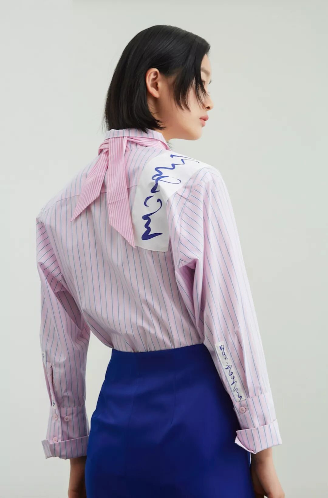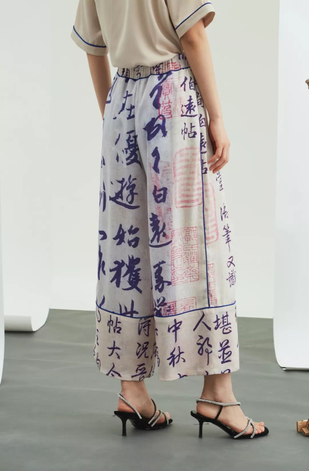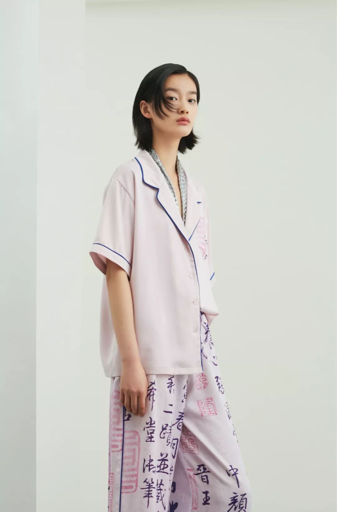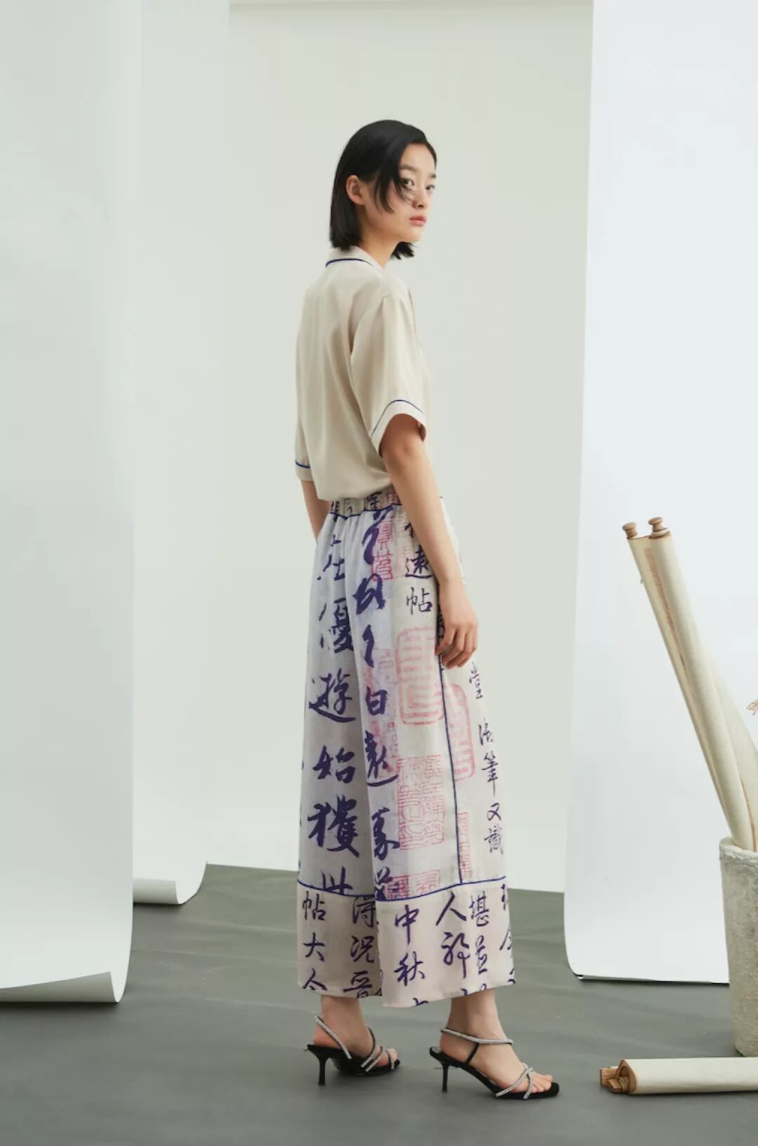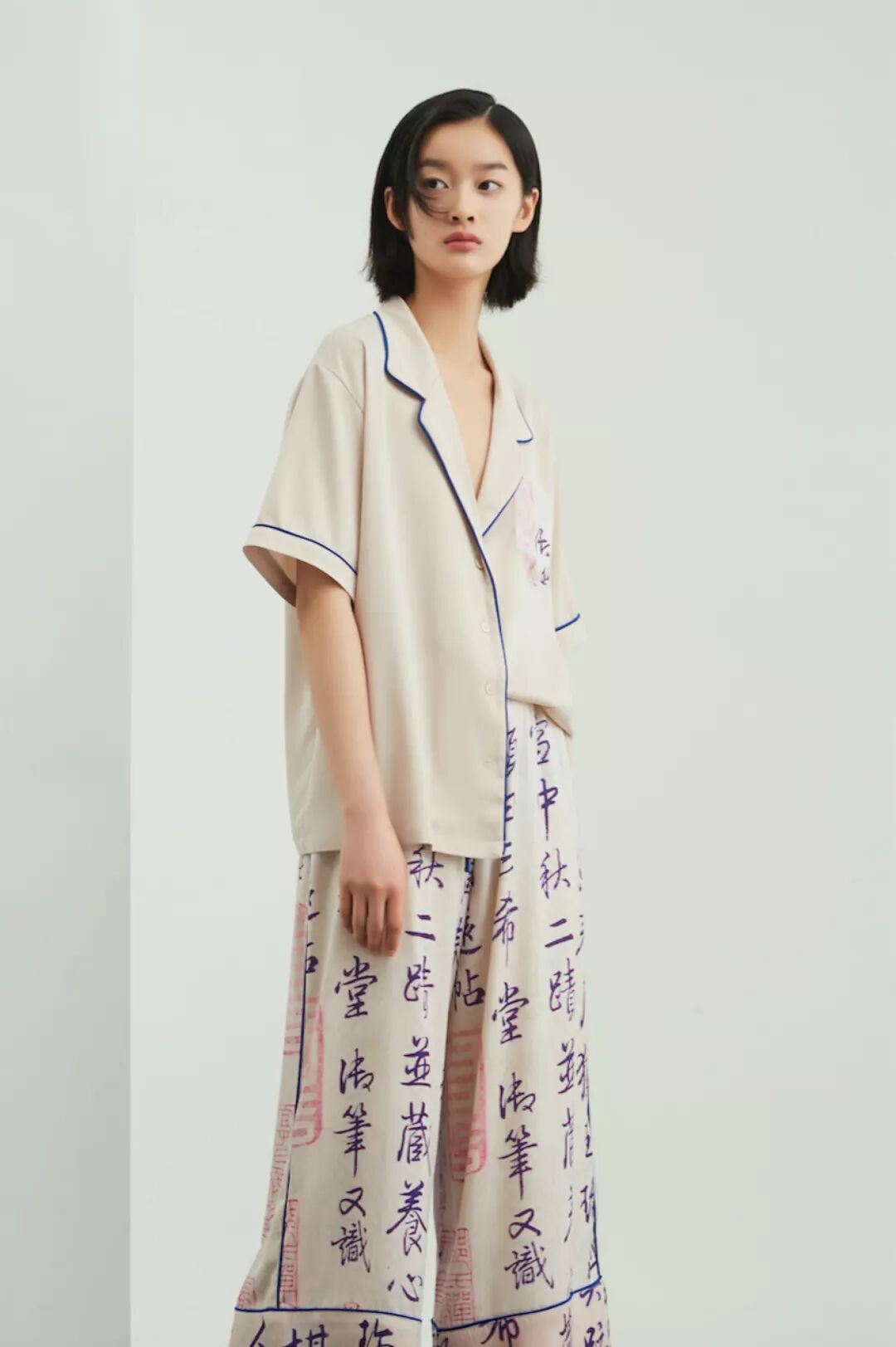 Min Wu,将设计师个性中对青年街头酒文化的偏爱,以清代后妃吉服上“书画”吉庆图纹为灵感源,故 宫博物院馆藏的《宋广草书太白酒歌轴》等 3 幅书画,将中国传统书法的飘逸潇洒融入到现代潮流设计中。注入跨界系列中,表达春日游园、酒歌长乐的欢喜感,带来 16 件街头潮流单品。