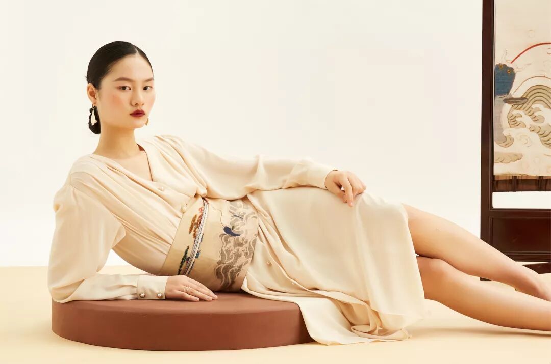 吉服好运核心综述:明代通袖袍吉服,纹饰多较尊贵,多饰以飞鱼等祥禽瑞兽图案。设计师 Dido Liu 选 用《海错图》海底瑞兽图案,致意吉服好运。
