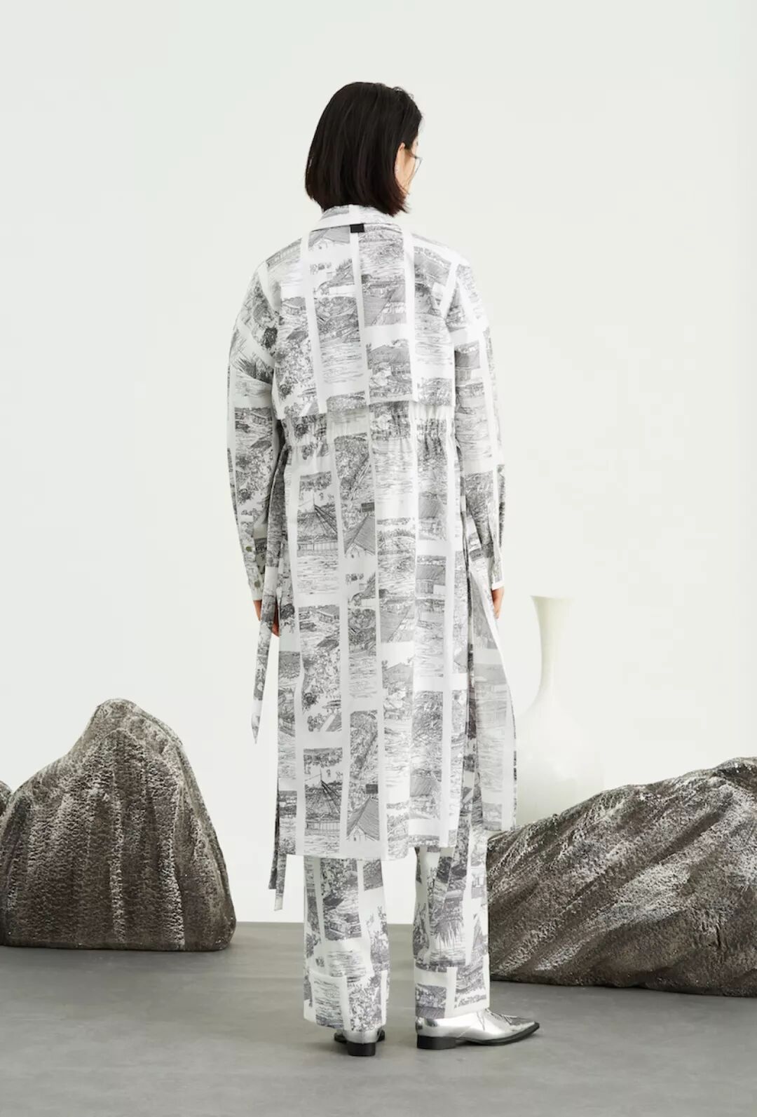 梦会停,以吉服文化中吉庆之会和时令节日为灵感来源,选用《清明上河图》,回潮北宋晚期都城汴京的商贾繁华、赶集会的安福吉庆场景;同时以现代设计手法和别致创新的“鬼裁”版型剪裁,在复古与吉服色中,复活古典文化,带来系列极具艺术感的 25 件单品