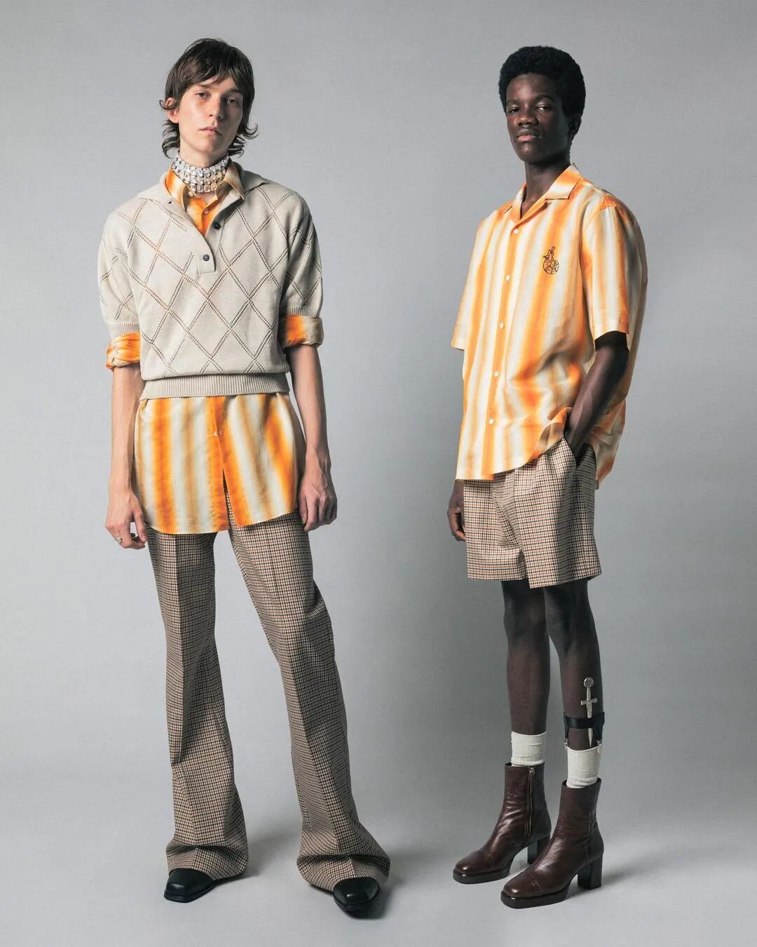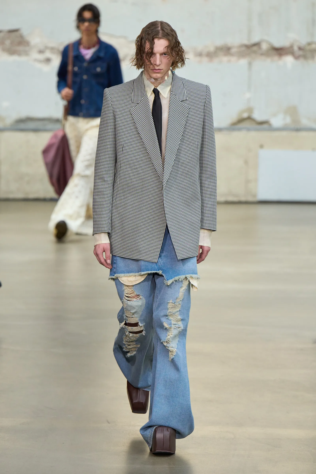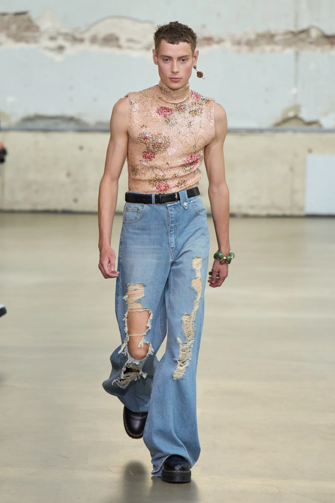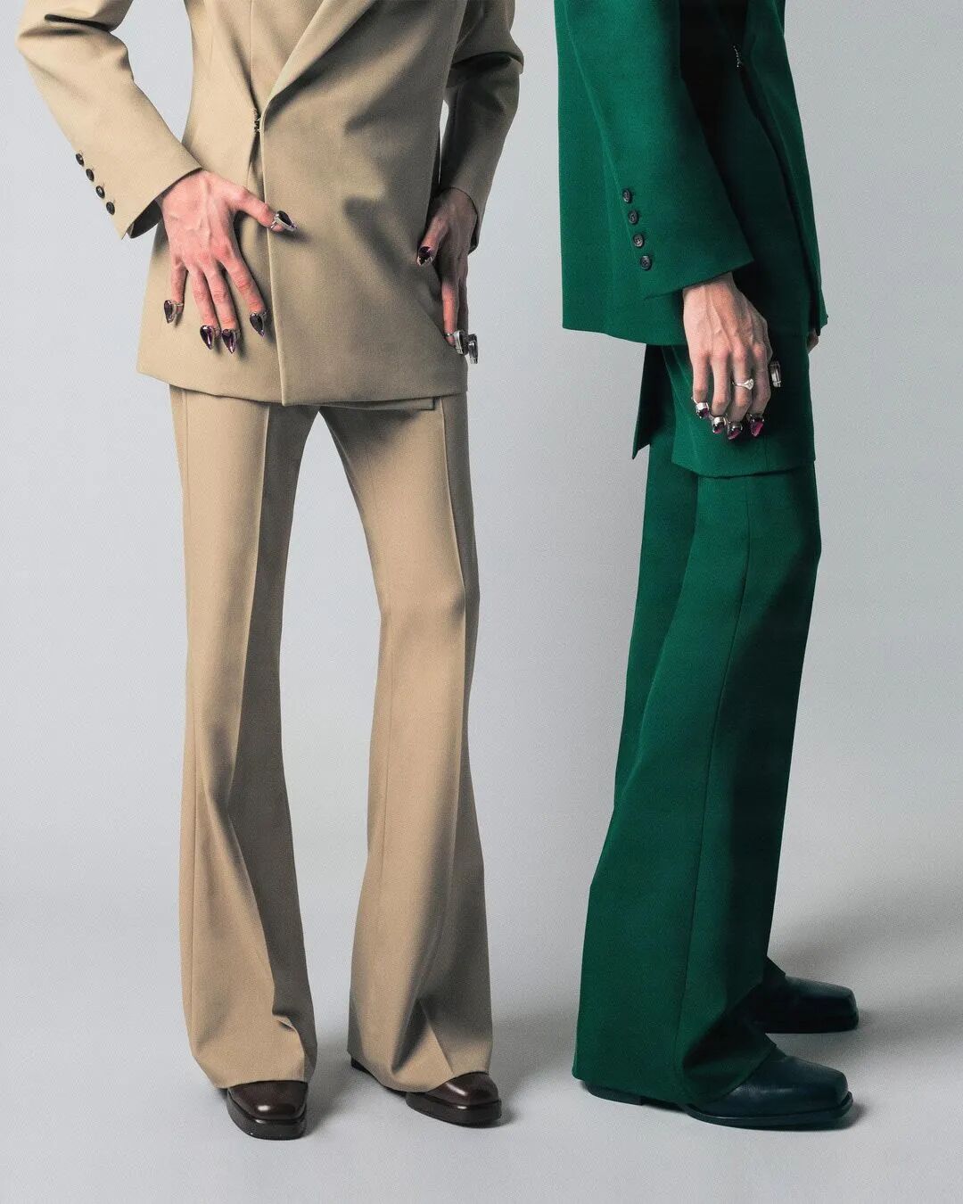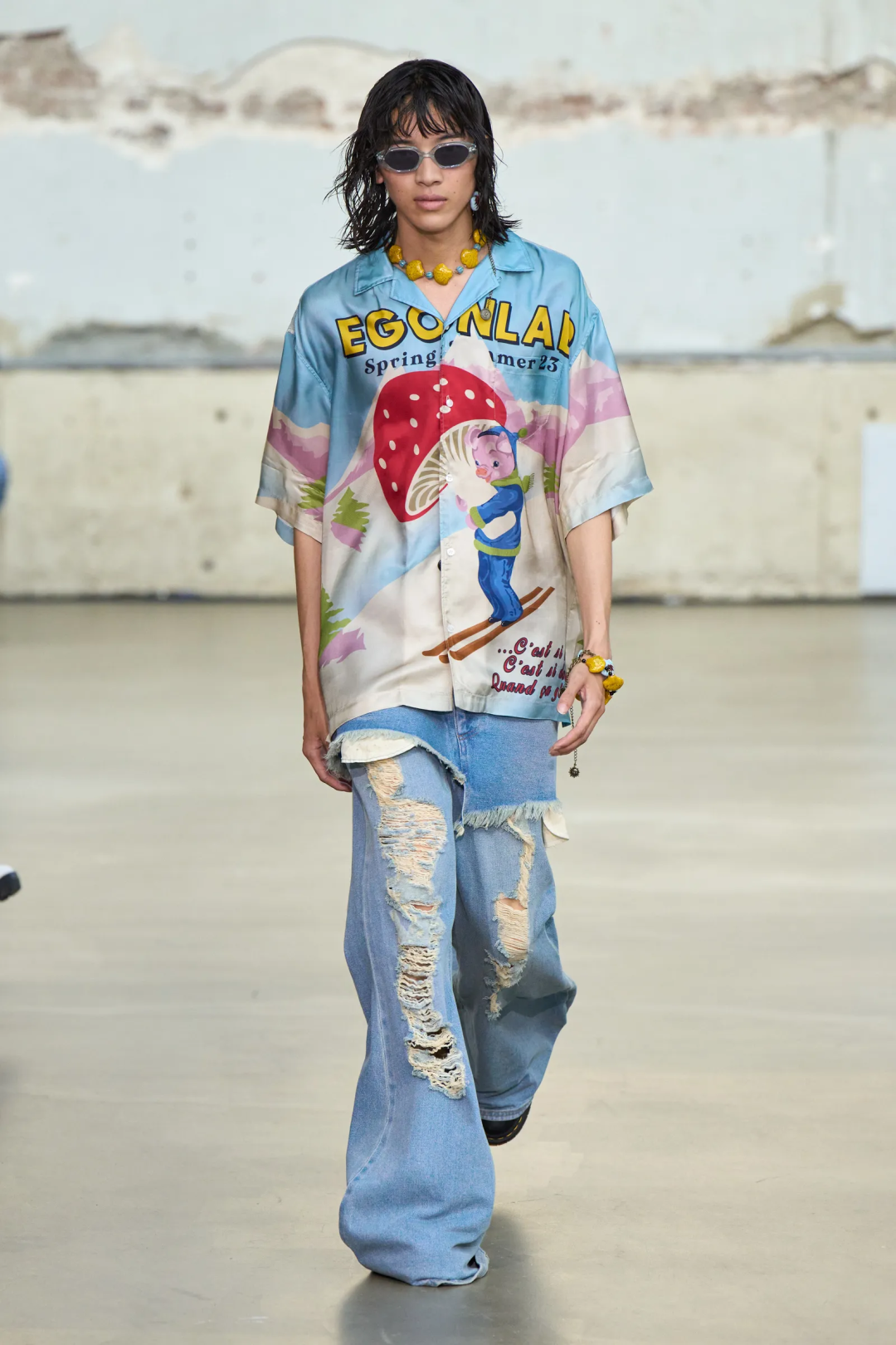 2023春夏季度中,Egon Lab延续其无性别的设计风格。阔腿破洞牛仔裤与西装和亮片背心的搭配就是都市朋克风格与正装相融合,丰富的色彩和精良的剪裁设计,演绎出时尚的多样可能性。