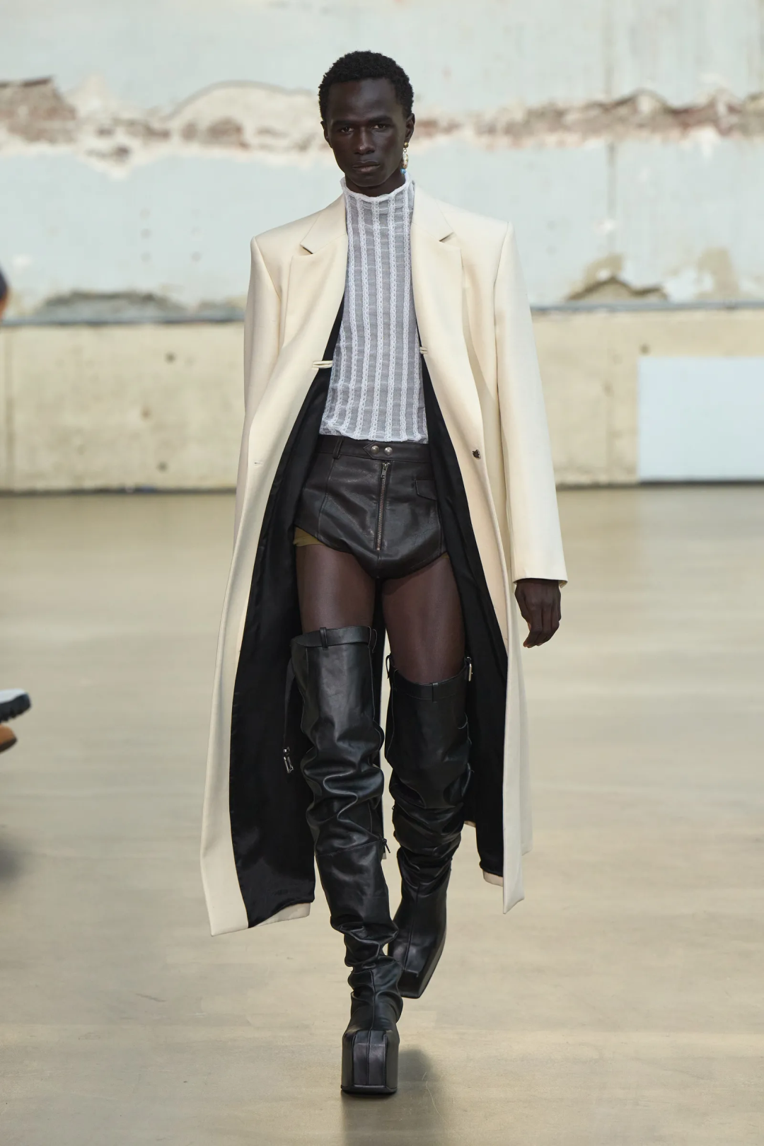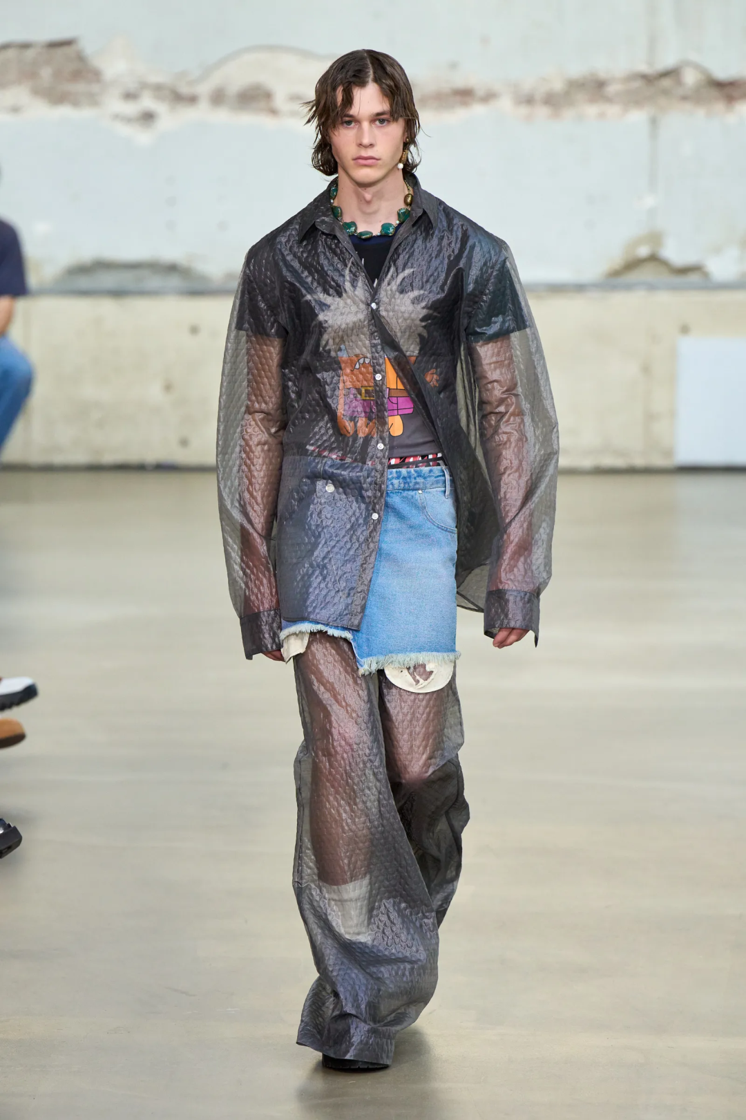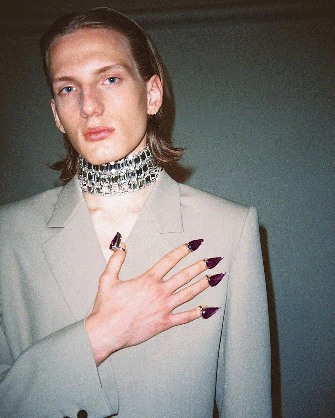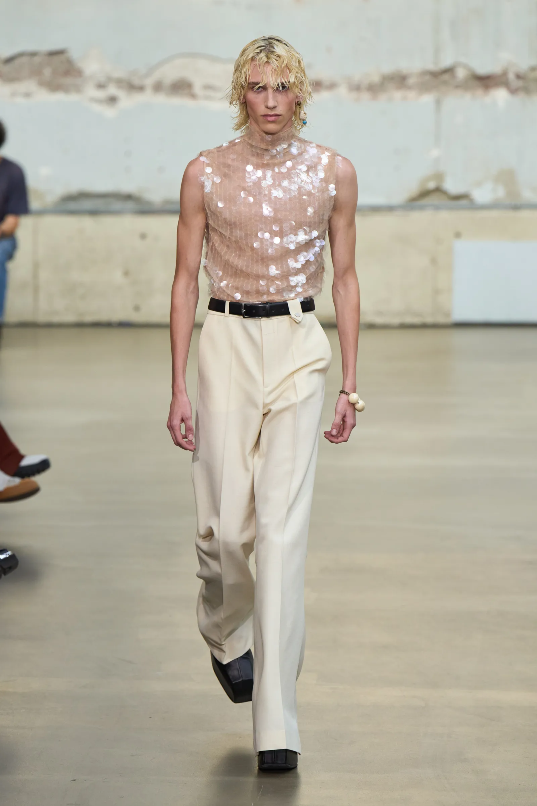 2023春夏季度中,Egon Lab延续其无性别的设计风格。阔腿破洞牛仔裤与西装和亮片背心的搭配就是都市朋克风格与正装相融合,丰富的色彩和精良的剪裁设计,演绎出时尚的多样可能性。