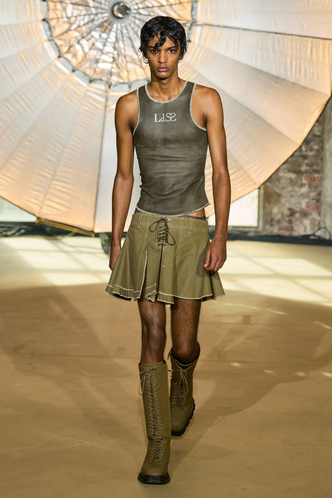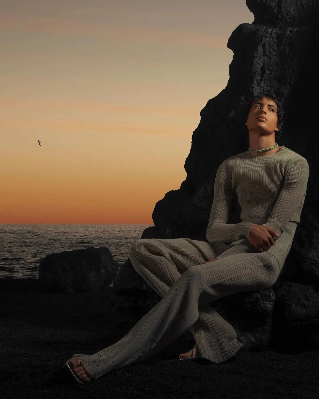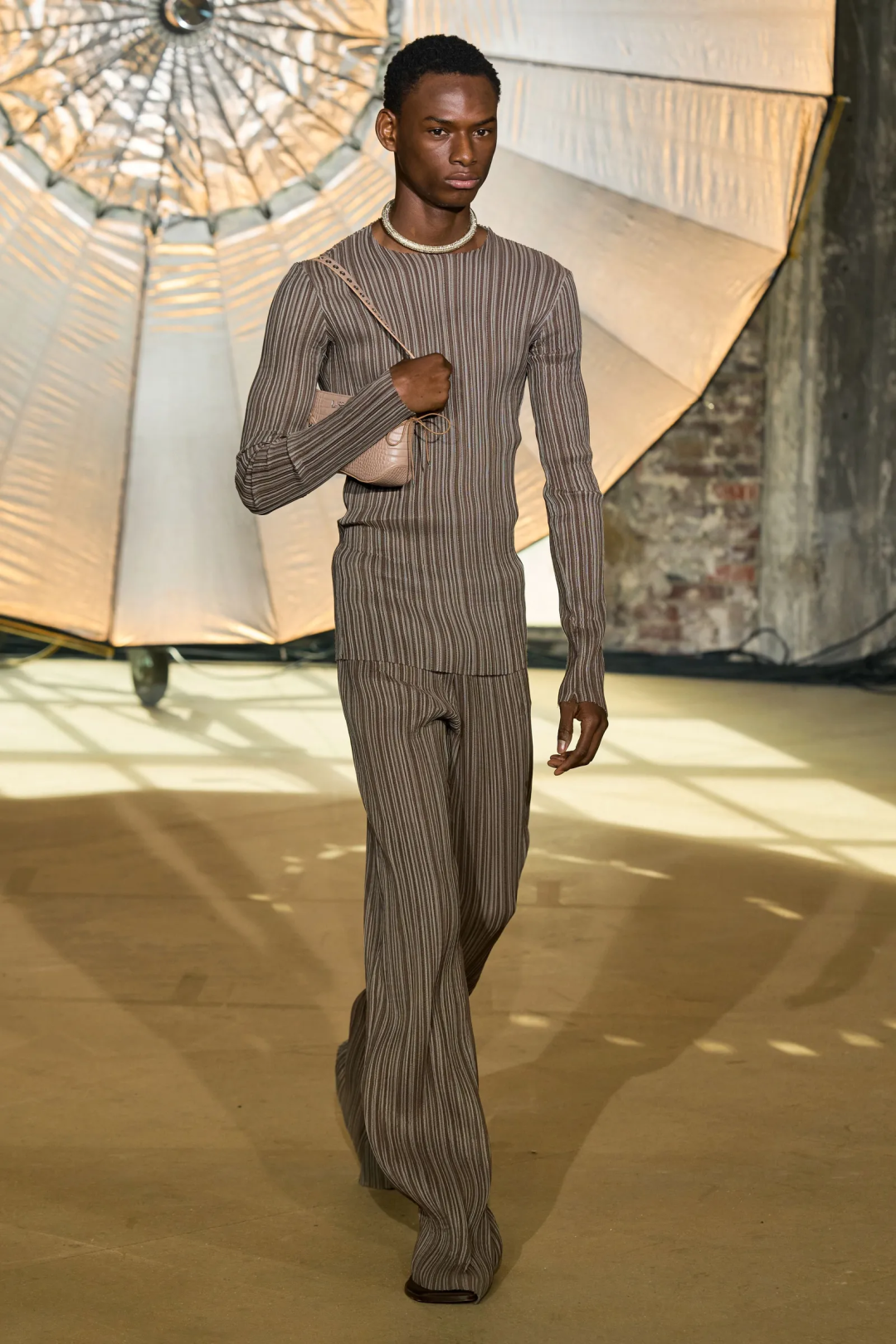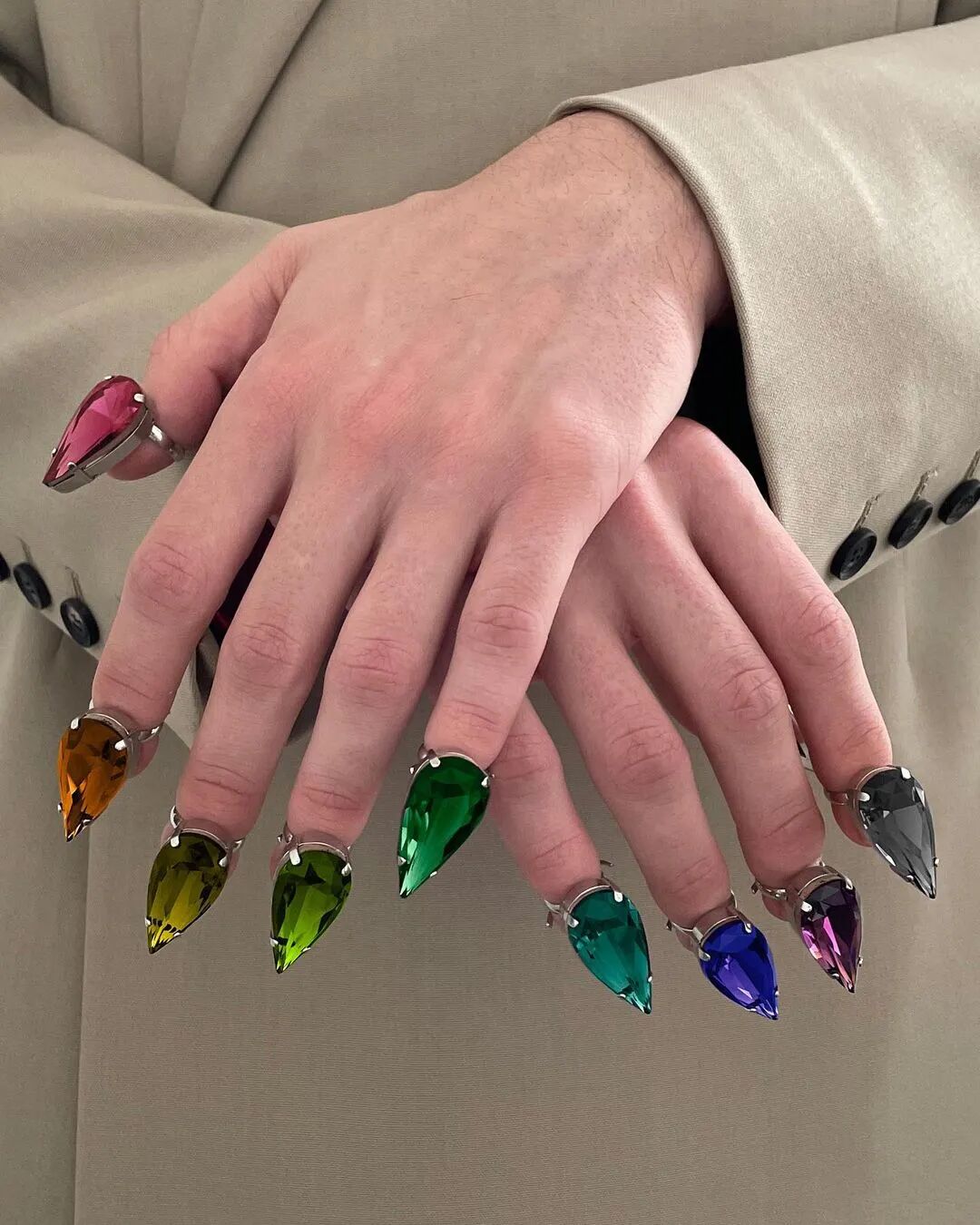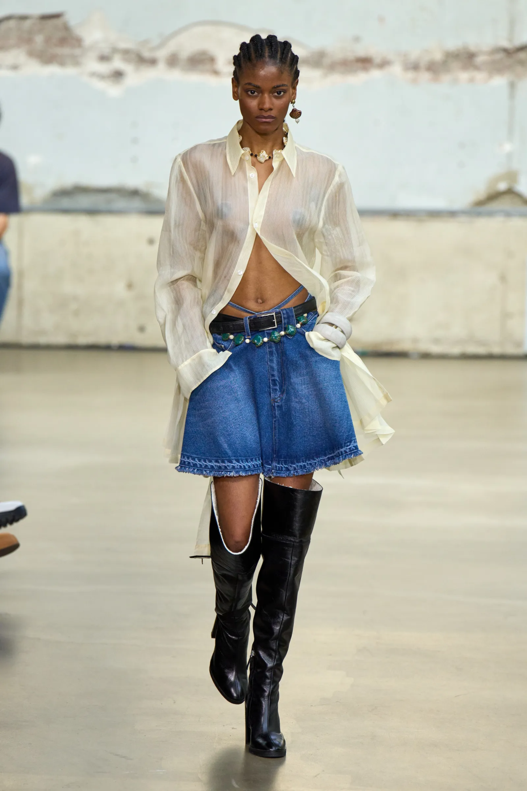 2023春夏季度中,Egon Lab延续其无性别的设计风格。阔腿破洞牛仔裤与西装和亮片背心的搭配就是都市朋克风格与正装相融合,丰富的色彩和精良的剪裁设计,演绎出时尚的多样可能性。