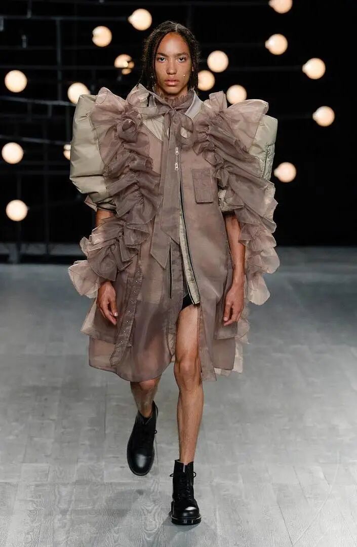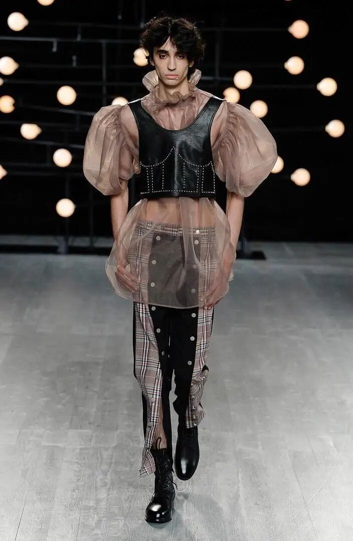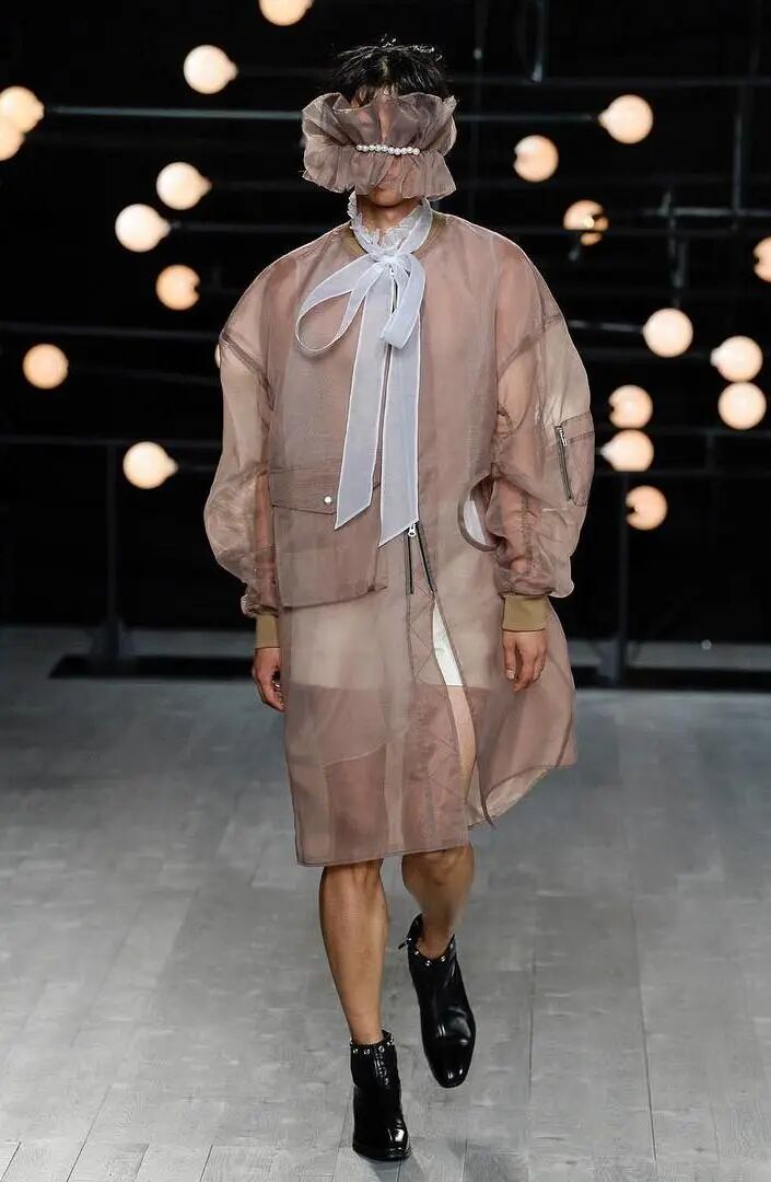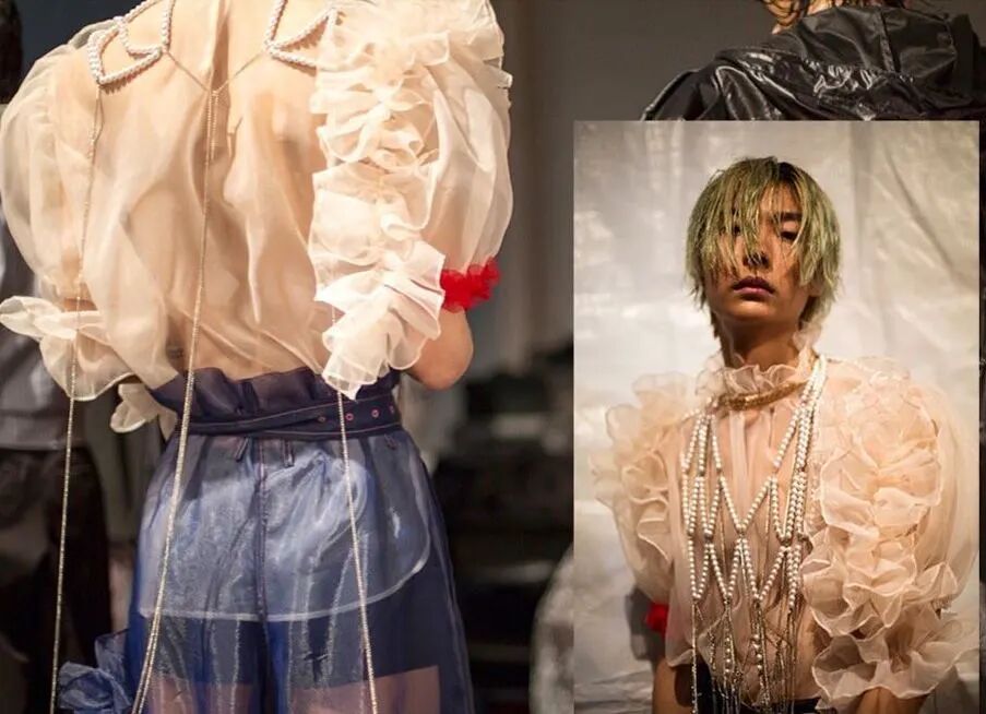 自成立以来,设计师就将“去性别化”这个概念践行到极致,他们尝试运用复杂的珍珠装饰、飘逸的缎带和荷叶边来装点现代男装,珍珠、薄纱、蕾丝、粉红,这些本该拥有性别的元素,统统都被Blindness抛在脑后。