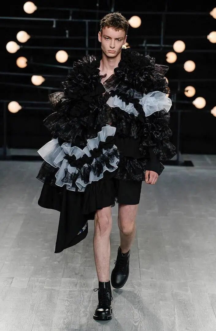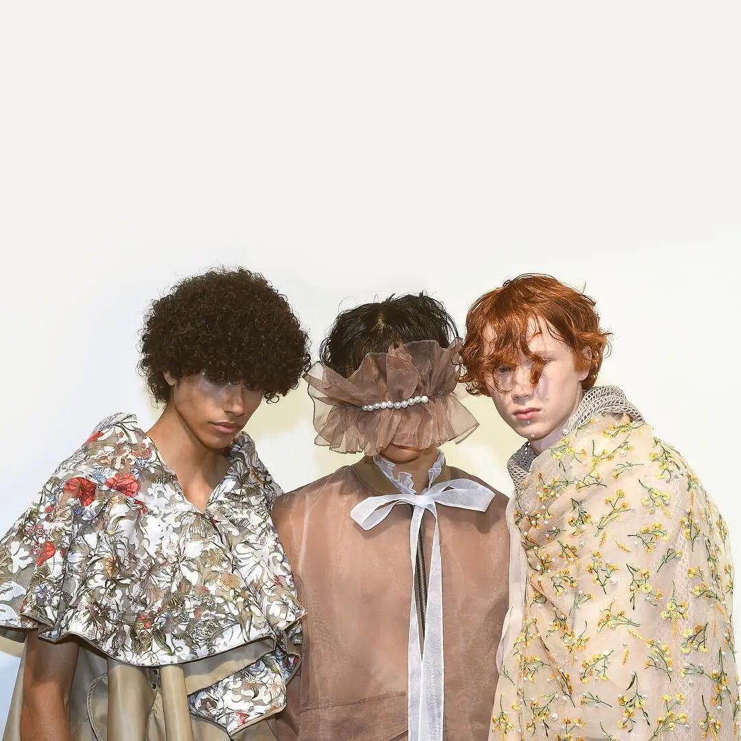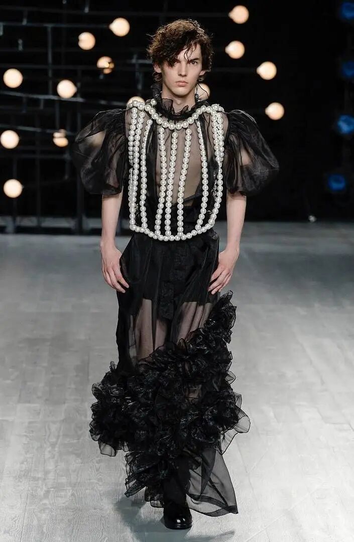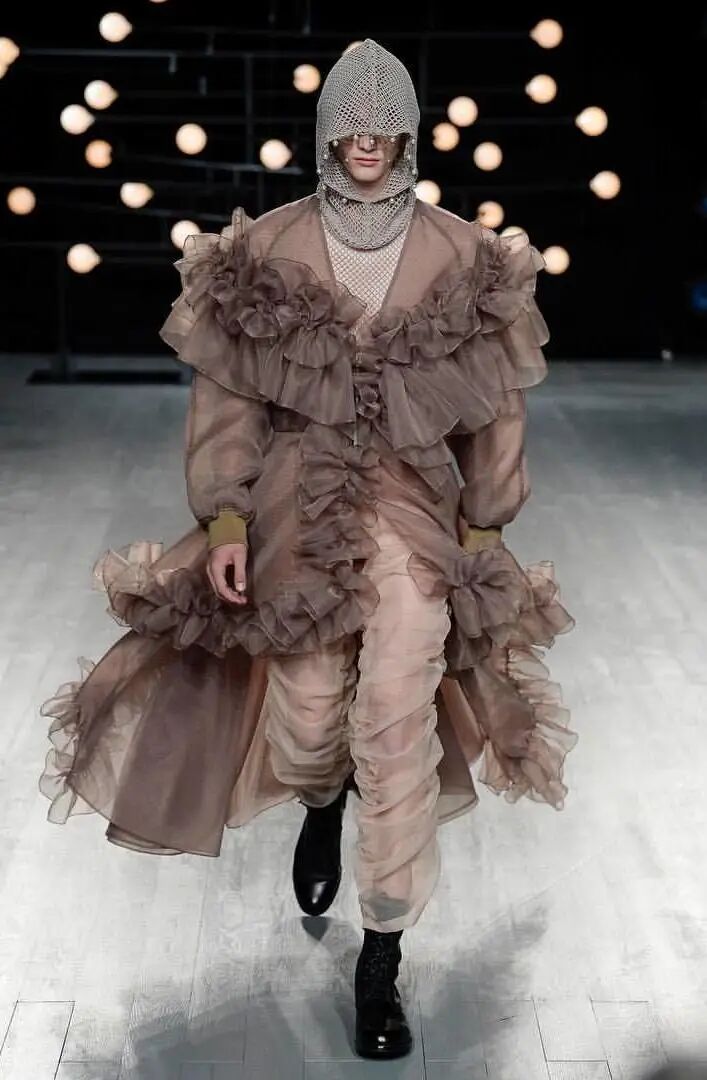 2019春夏系列充斥着浪漫主义的巴洛克风格并且有一股很浓厚的英式上流社会感觉。华丽的薄纱点缀和精致的珍珠镶嵌搭配上刚刚好的效果,就像是用服装去描述了英国绅士。用各种头罩去模糊模特性别,让人第一眼容易产生错觉,并且使用了各种珍珠,荷叶边,纱质透明面料抽褶等手法进行装饰。