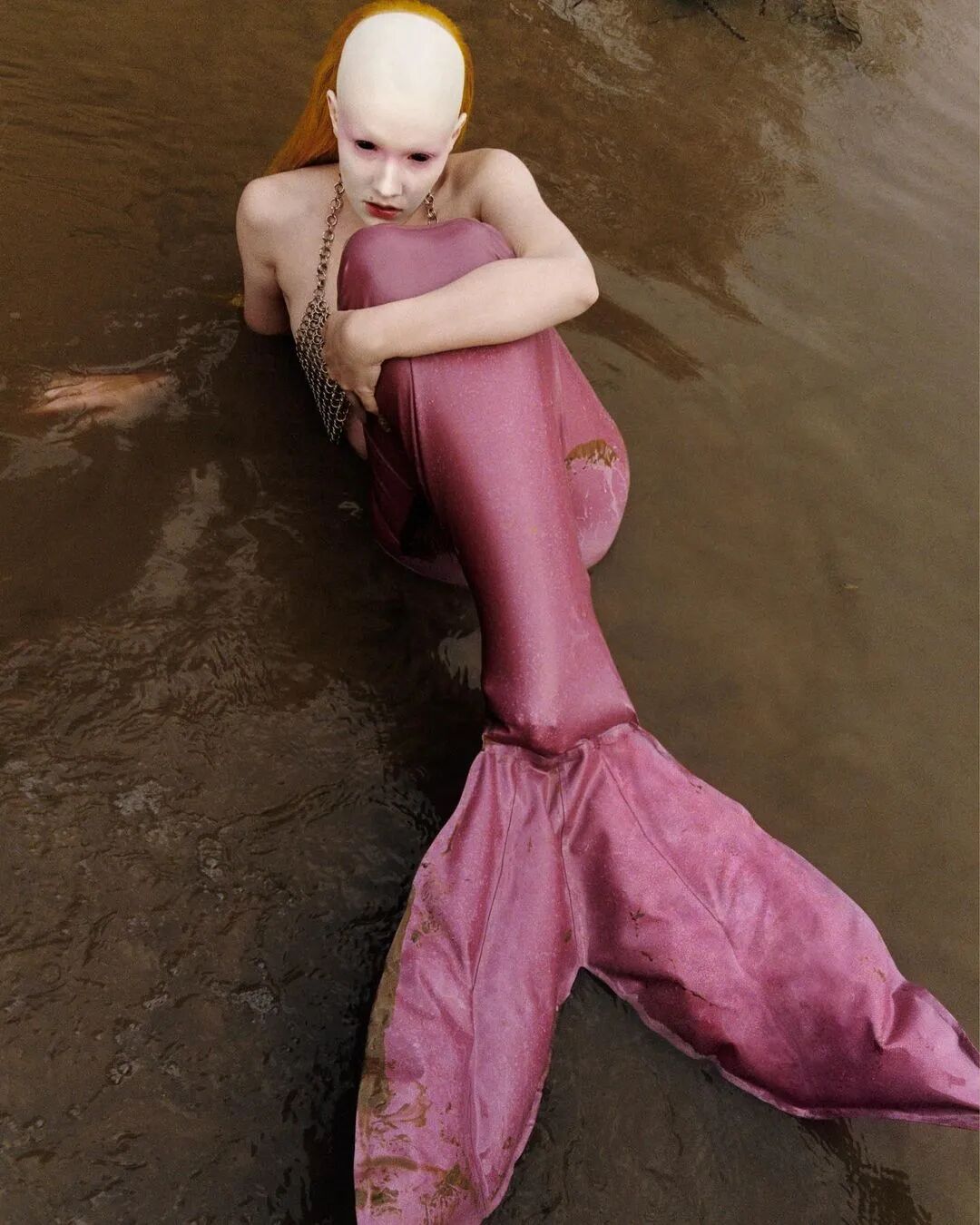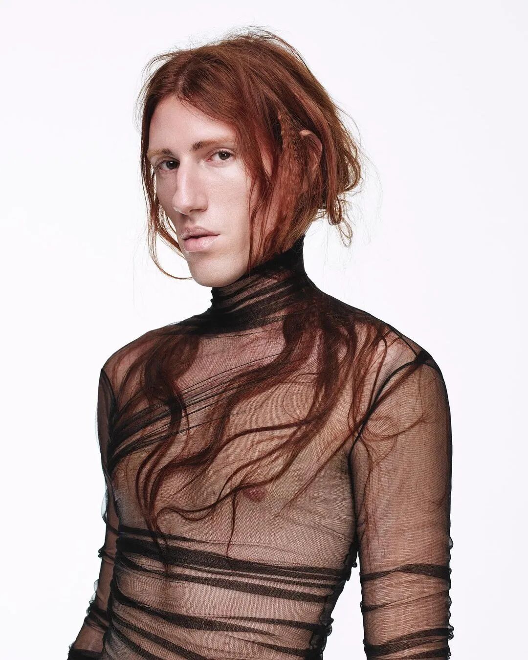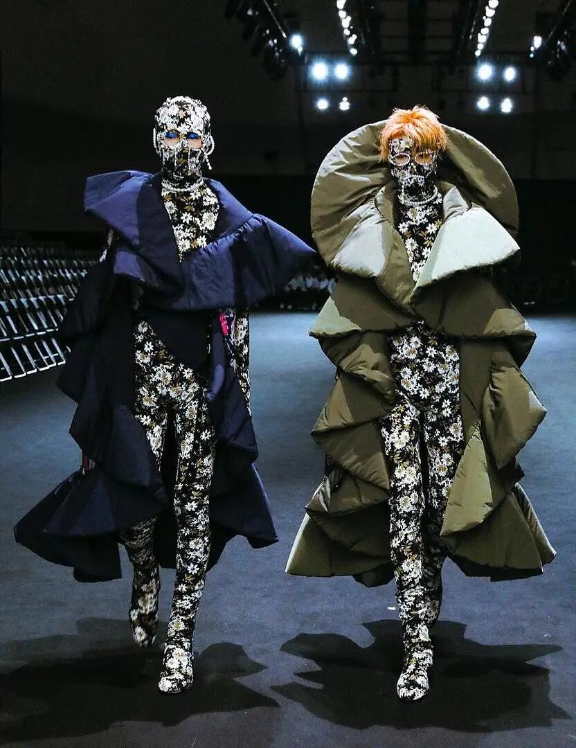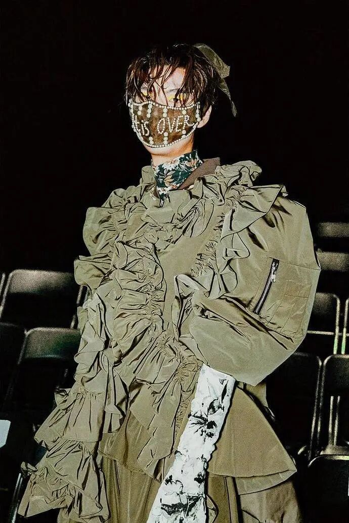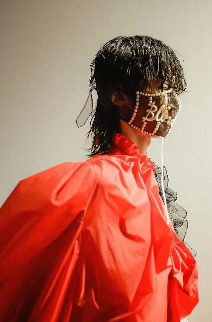 长头发,带眼罩或者面罩,这些都是Shin和Park经常用来掩盖自己的模特的手法,这样做的目的是为了让观众忽略掉模特的性别,更关注服装本身。